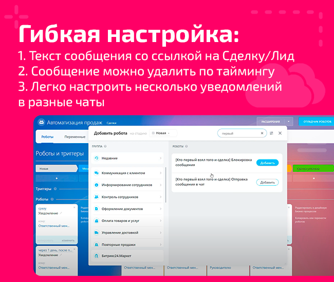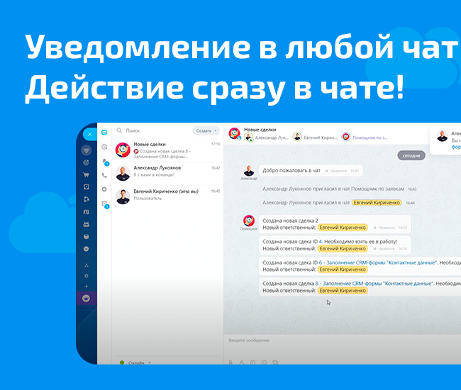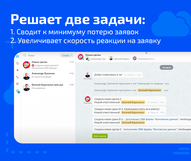 Как только появляется новая заявка (лид/сделка), все менеджеры узнают об этом в отдельном чате (не колокольчик).
