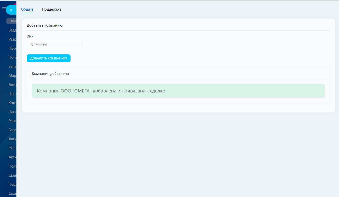 - Для корректной работы необходимо создать поле "ИНН" (обязательное поле) в сделке или лиде