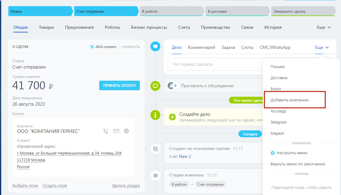 - Есть возможность добавить компанию по ИНН к лиду из лида или к сделке из сделки. Для этого необходимо в меню таймлайна выбрать пункт "Добавить компанию" и ввести ИНН, после этого компания будет создана и привязана к лиду или сделке
