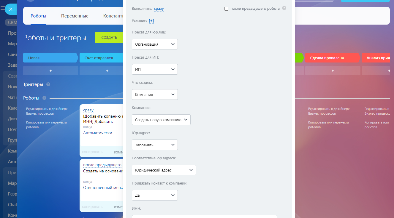 Робот создаёт компанию на определённой стадии сделки или лида. Также робот заполняет банковские реквизиты для компании по БИК.