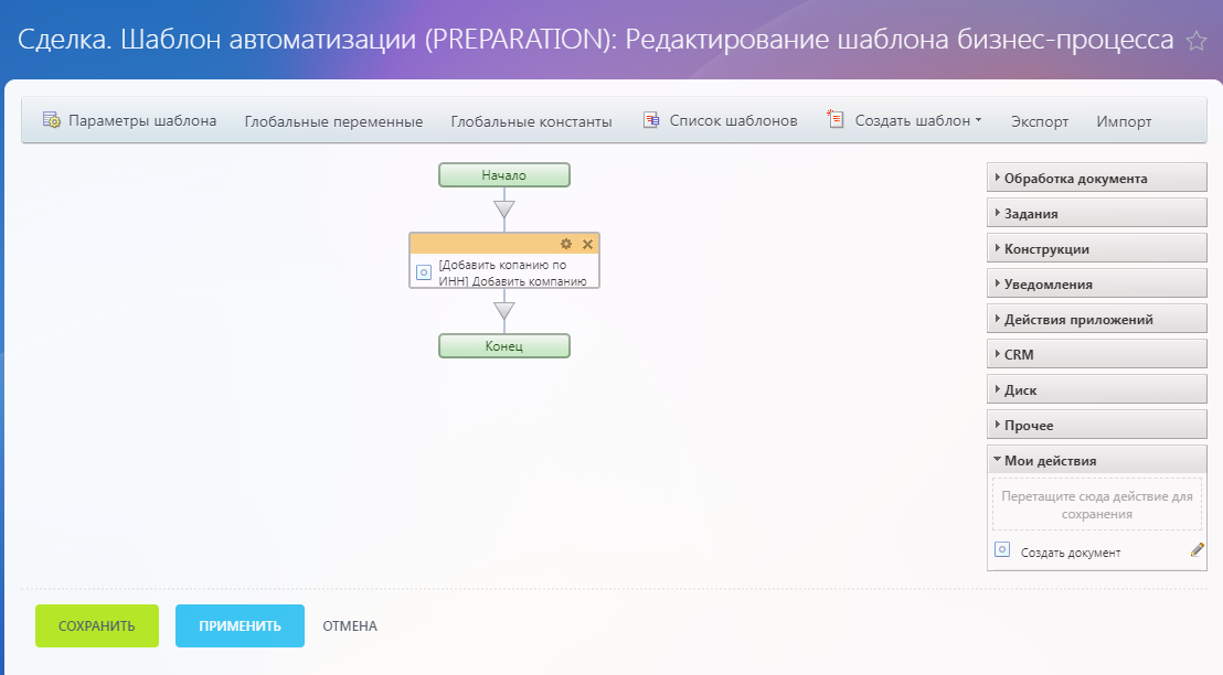 Приложение работает автоматически без дополнительных действий со стороны сотрудника! Приложение проверяет, существует ли компания в списке ваших компаний. Если компания уже существует, то в сделку или лид добавится эта компания. Если компании с указанным ИНН нет в вашем списке компаний, робот создаст компанию и добавит ее к сделке или лиду.
