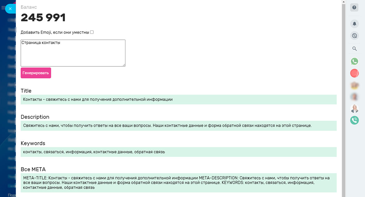 Приложение генерирует текст для для meta тегов и текст для любого блока вашего сайта.