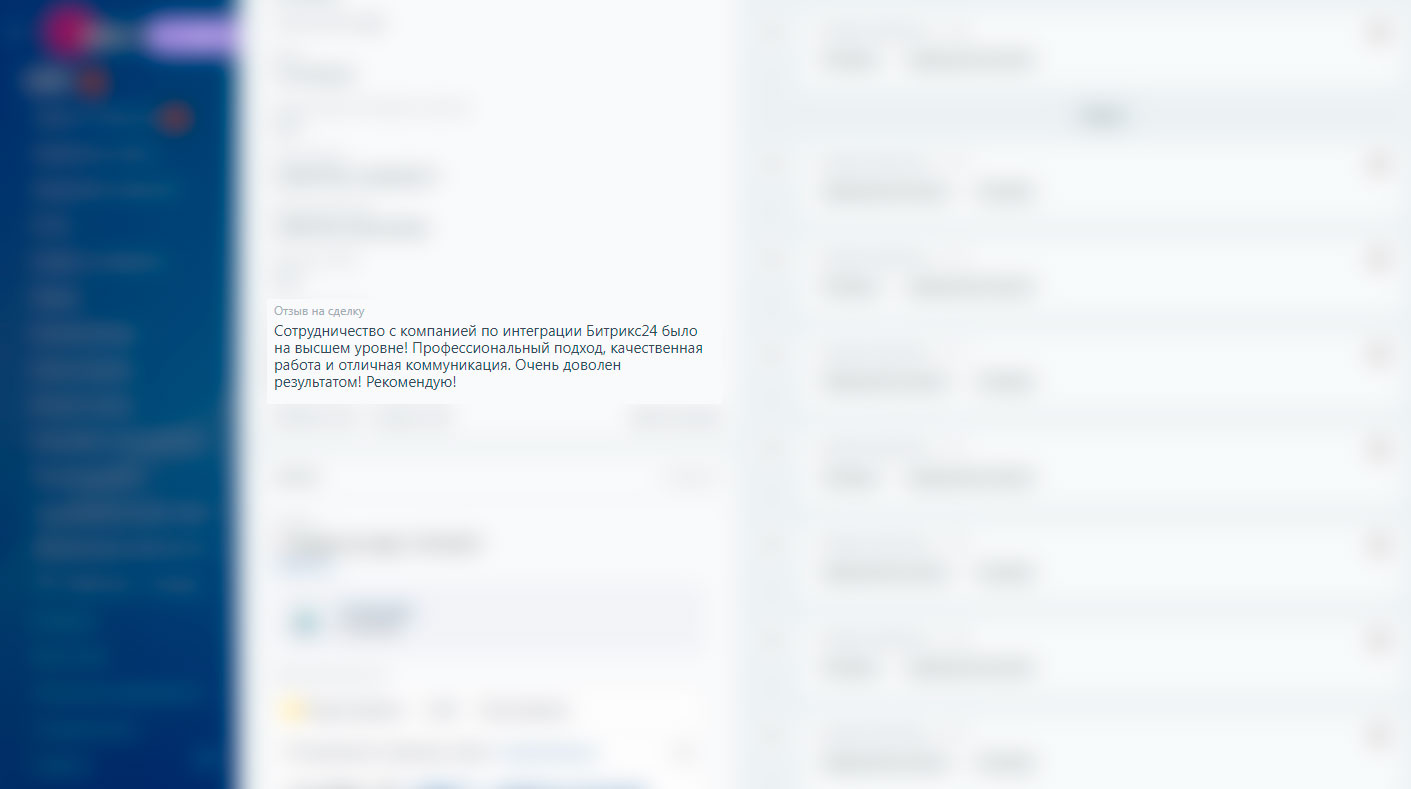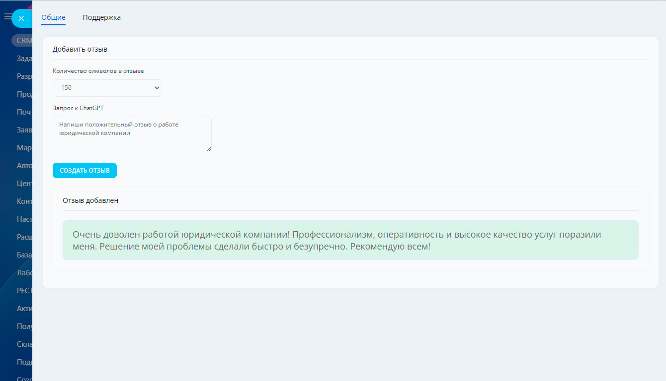 Приложение само сгенерирует отзыв за клиента на нужной вам стадии. Например, после перехода сделки в стадию успешной или сразу в момент создания сделки. Отзыв появится в вашей карточке сделке или лида. Готовый отзыв вы можете отправить сами. Или настроить робота, который будет отправлять сгенерированные отзывы на email или в мессенджеры клиентов, и, таким образом, полностью автоматизировать этот процесс.