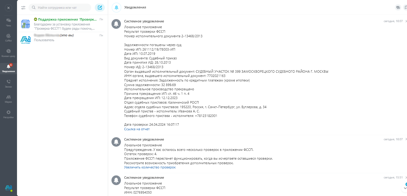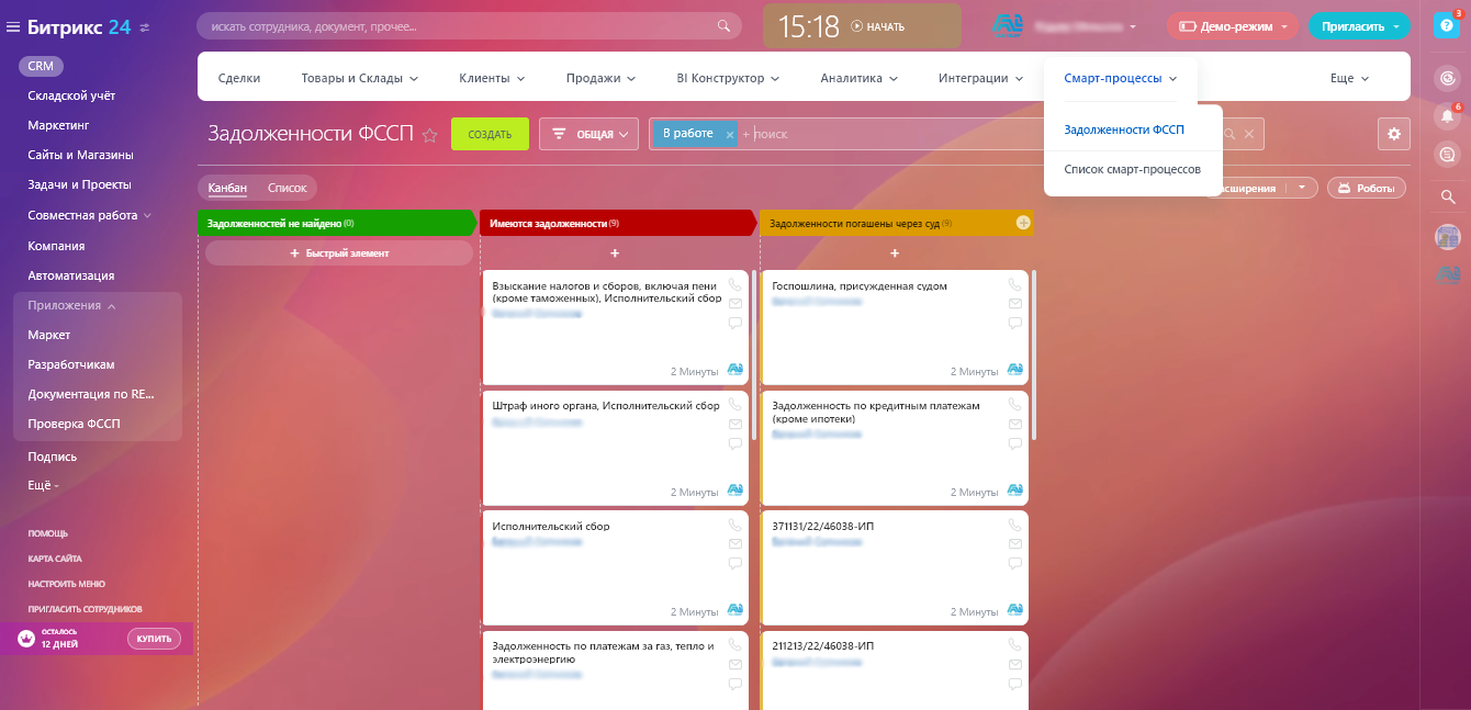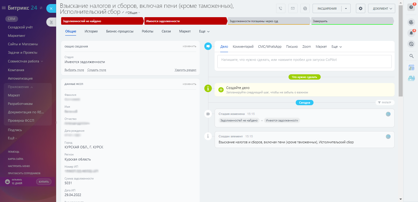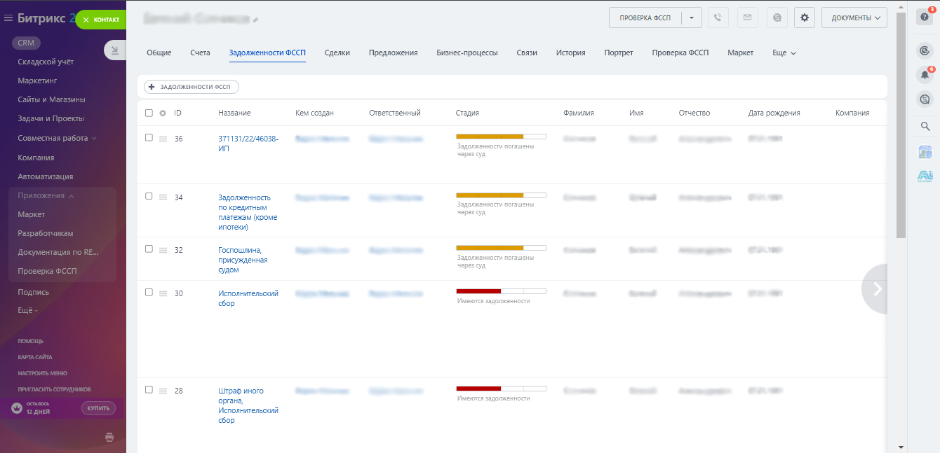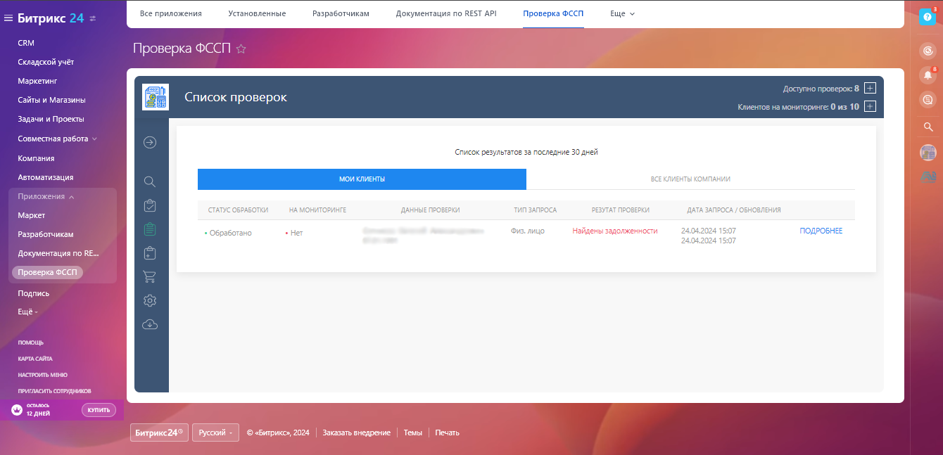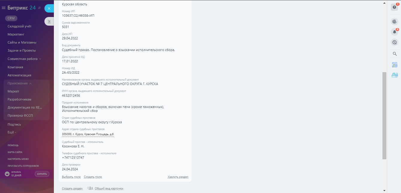 Приложение автоматически собирает и сохраняет подробную информацию о задолженностях ваших клиентов из базы данных ФССП. Каждая задолженность сохраняется как отдельная запись с полными данными клиента и детальной информацией о долге. [Подробнее о смарт-процессе "Задолженности ФССП"]