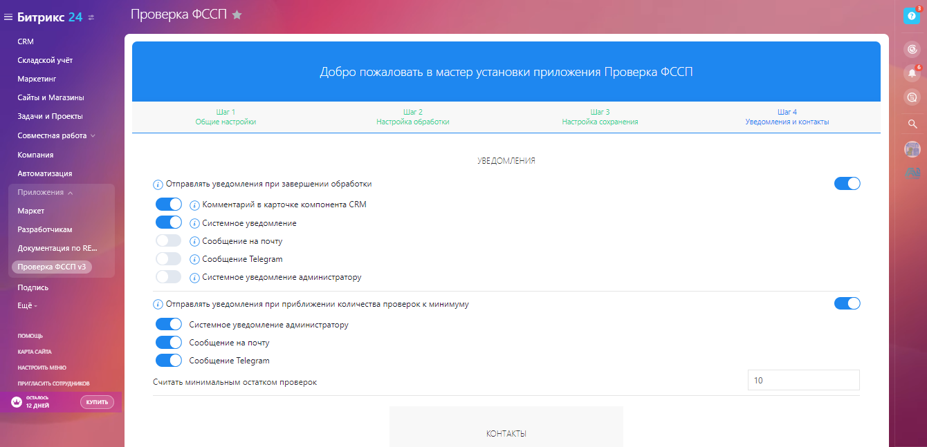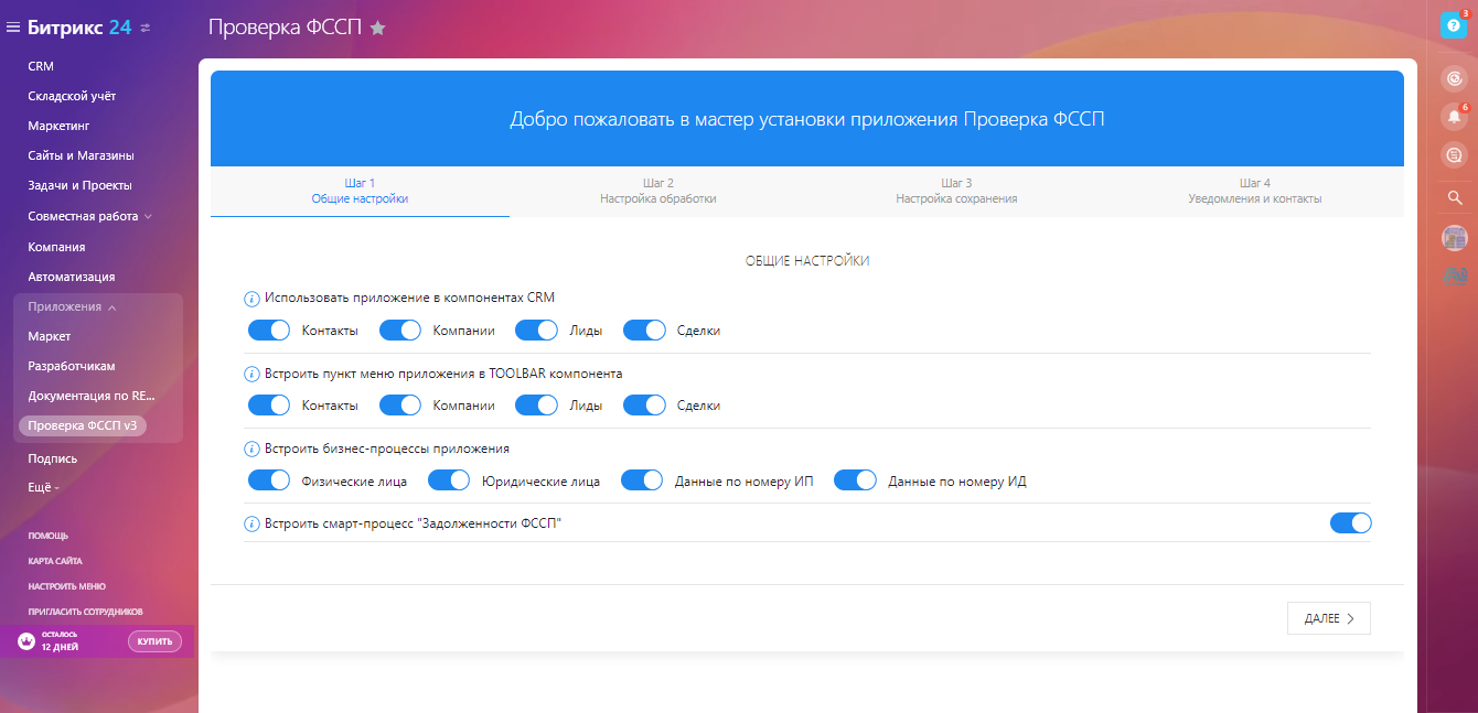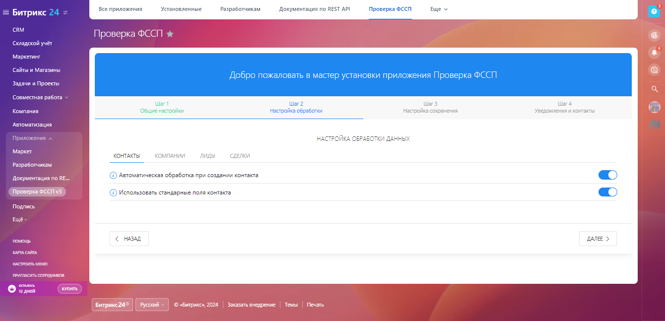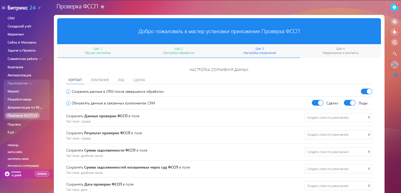 Мастер установки позволяет настроить приложение точно под ваши потребности. Вы можете указать, какие данные извлекать из вашей CRM (контакты, компании, лиды, сделки) и в каких полях сохранять полученную информацию. [Подробнее о настройках приложения]