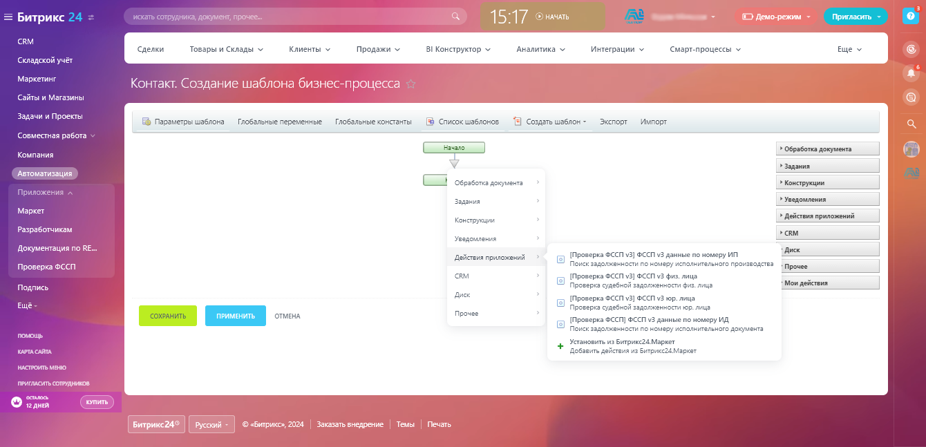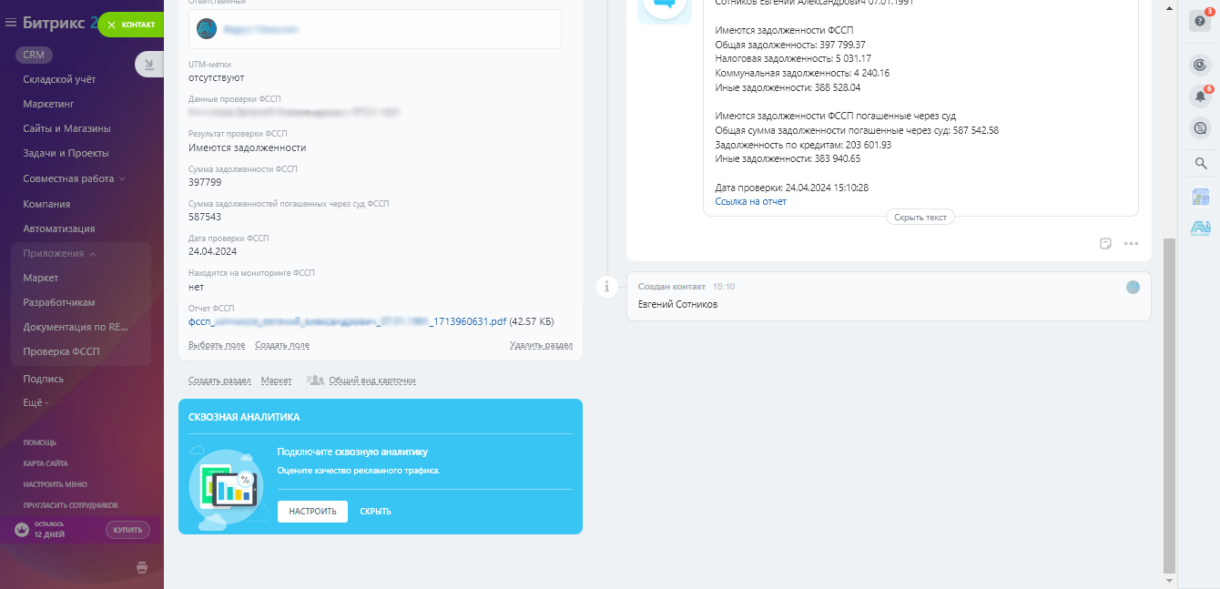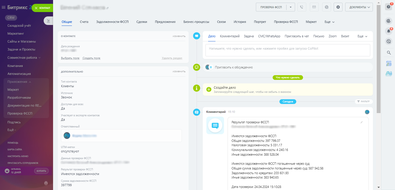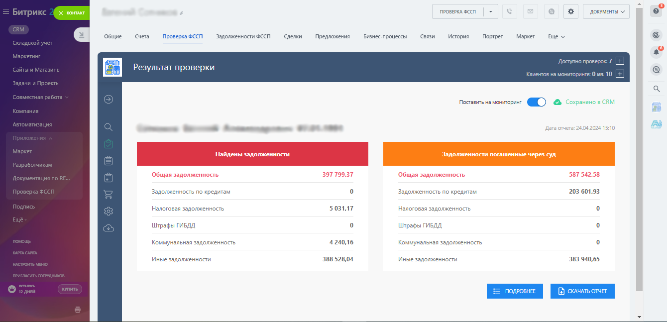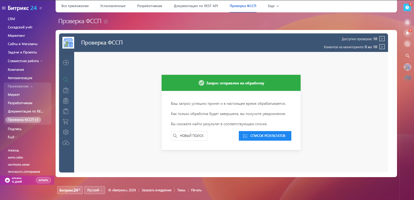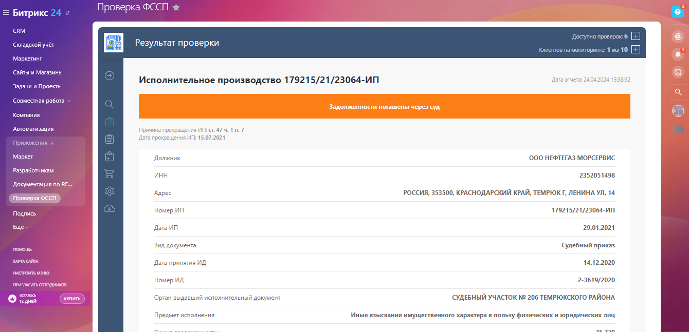 Приложение автоматический проверит клиента (физ. или юр. лицо) одним запросом по всем регионам на задолженность у судебных приставов прямо из CRM за несколько секунд, а с помощью бизнес-процессов вы сможете автоматизировать проверку клиента.