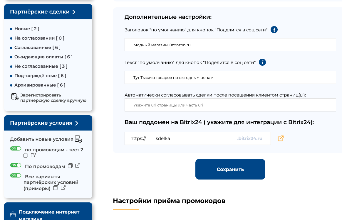 1. В случае совершения сделки по партнёрскому промокоду или партнёрской ссылке, данные о партнёрской продаже будут подтягиваться в интерфейс Битрикс24.