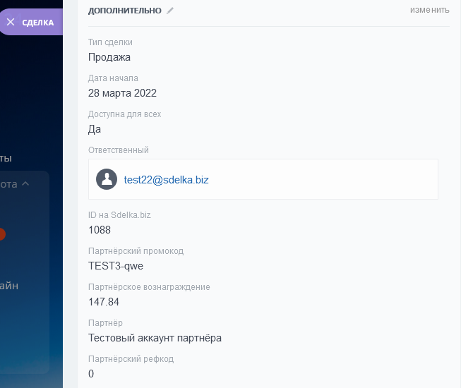 2. При ручном добавлении партнёрского промокода в сделку на Битрикс24, в вашем аккаунте продавца на Sdelka.biz будет создана партнёрская сделка и рассчитано партнёрское вознаграждение для партнёра. Данные о вознаграждении партнёра и его имя будет подгружены в Битрикс24.