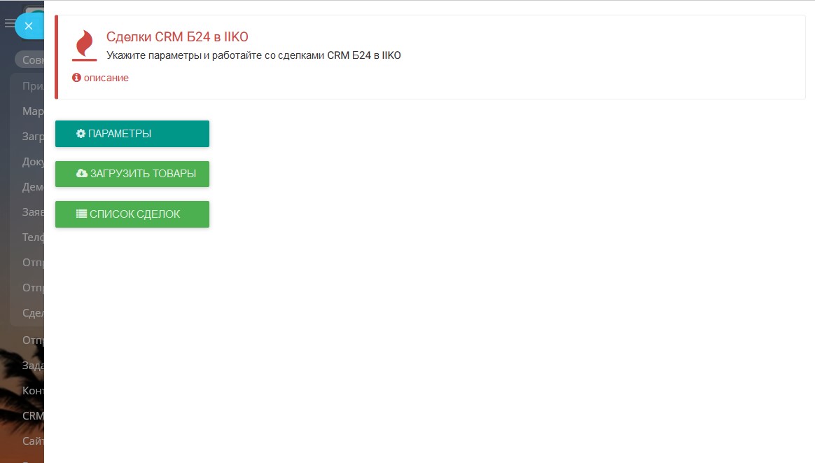 Приложение получает справочник номенклатуры IIKO, отправляет сделки, содержащие товары справочника номенклатуры IIKO, из CRM Битрикс24 в IIKO и получает статусы отправленных сделок в IIKO. Для подключения к IIKO необходимо задать корректные параметры, нажав соответствующую кнопку.
