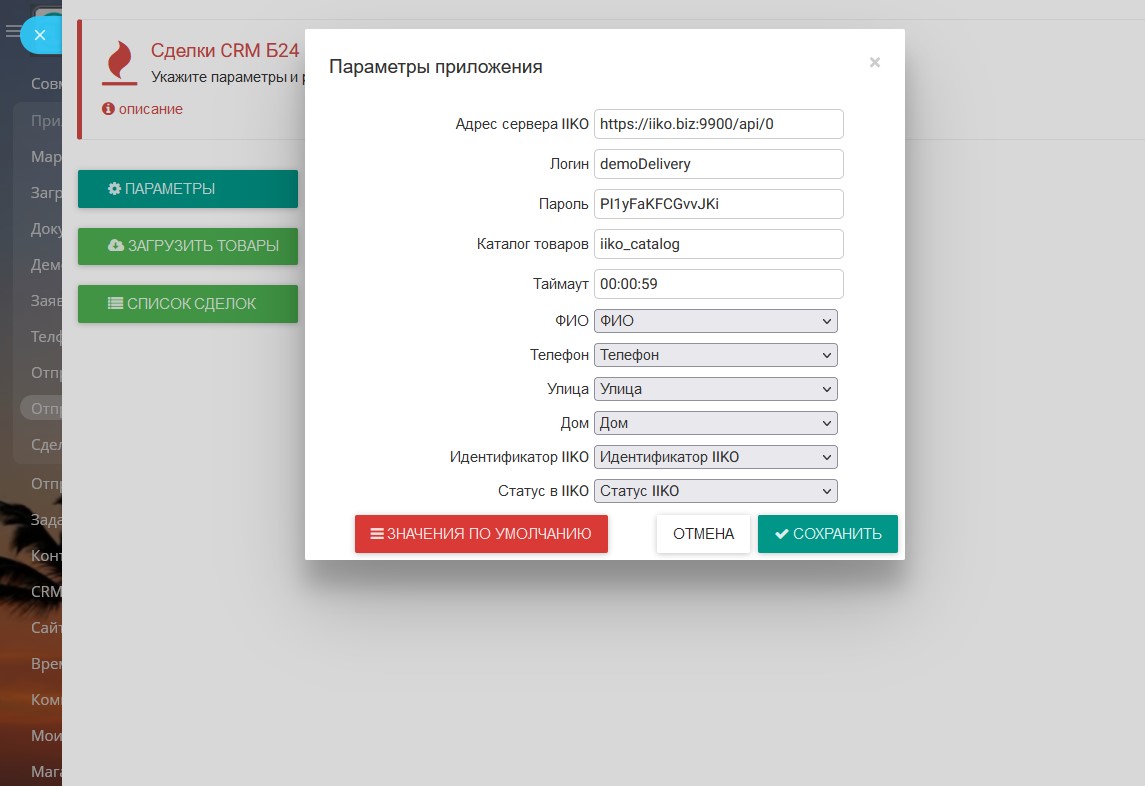 Приложение получает справочник номенклатуры IIKO, отправляет сделки, содержащие товары справочника номенклатуры IIKO, из CRM Битрикс24 в IIKO и получает статусы отправленных сделок в IIKO. Для подключения к IIKO необходимо задать корректные параметры.