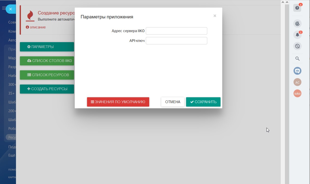Внимание! Ресурсы бронирования создаются с наименованиями, указанными для столов в IIKO. Приложение не создаёт ресурс с существующим наименованием.