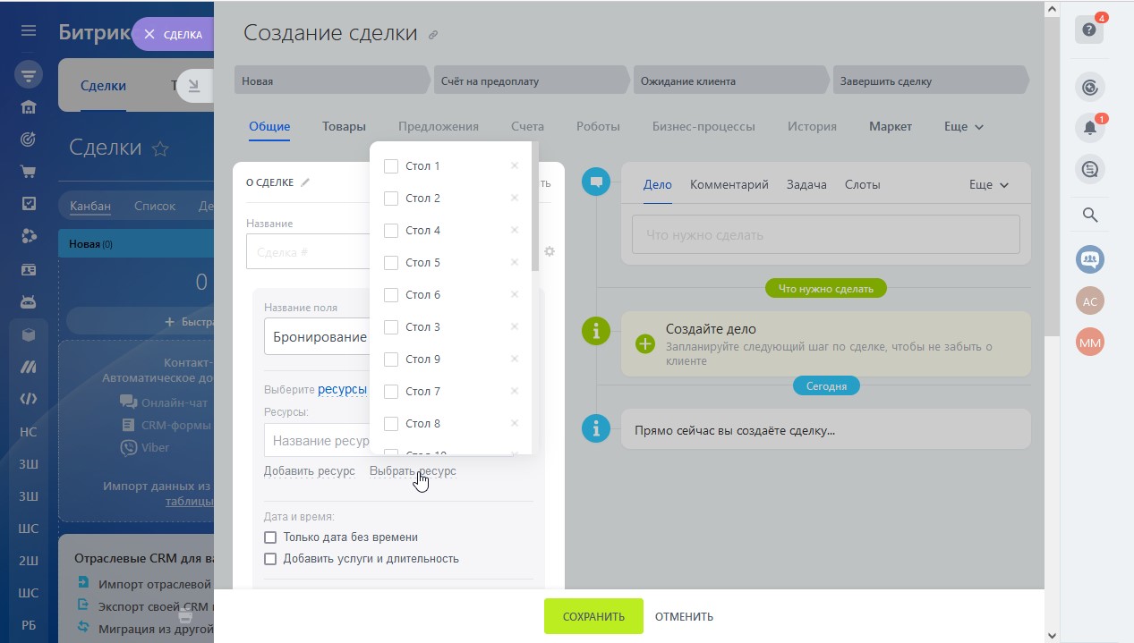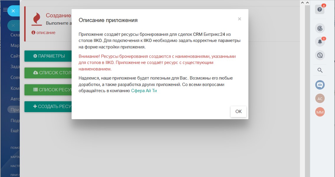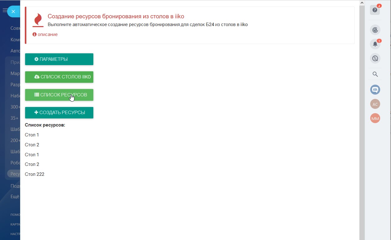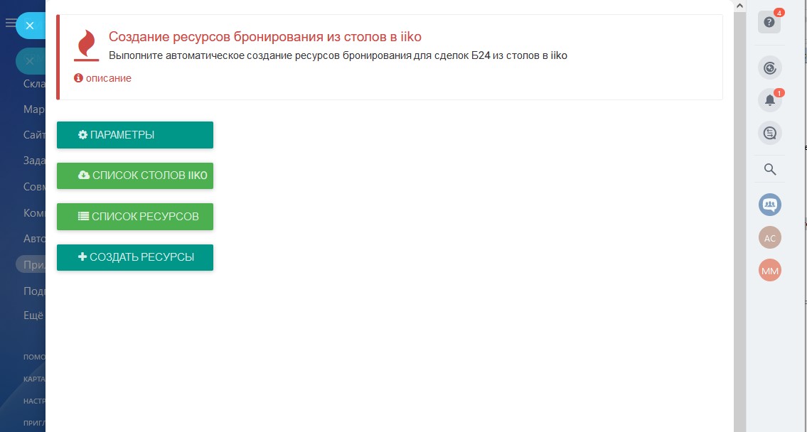 Приложение создаёт ресурсы бронирования для сделок CRM Битрикс24 из столов IIKO.