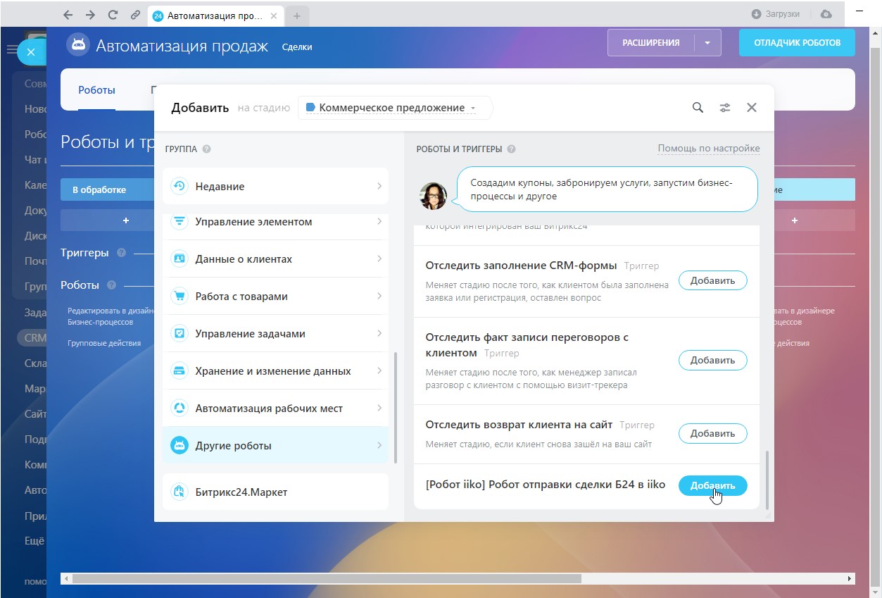 Приложение сoздаёт робота, который отправляет сделки, содержащие товары справочника номенклатуры IIKO, из CRM Битрикс24 в IIKO.