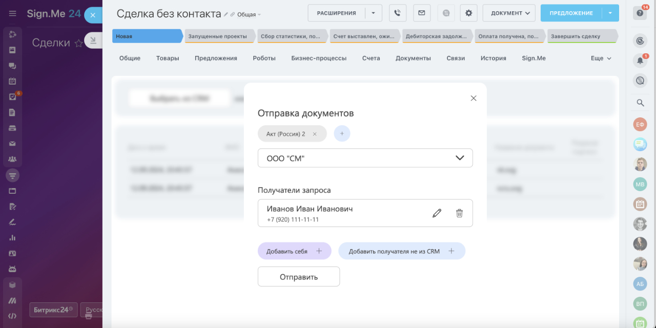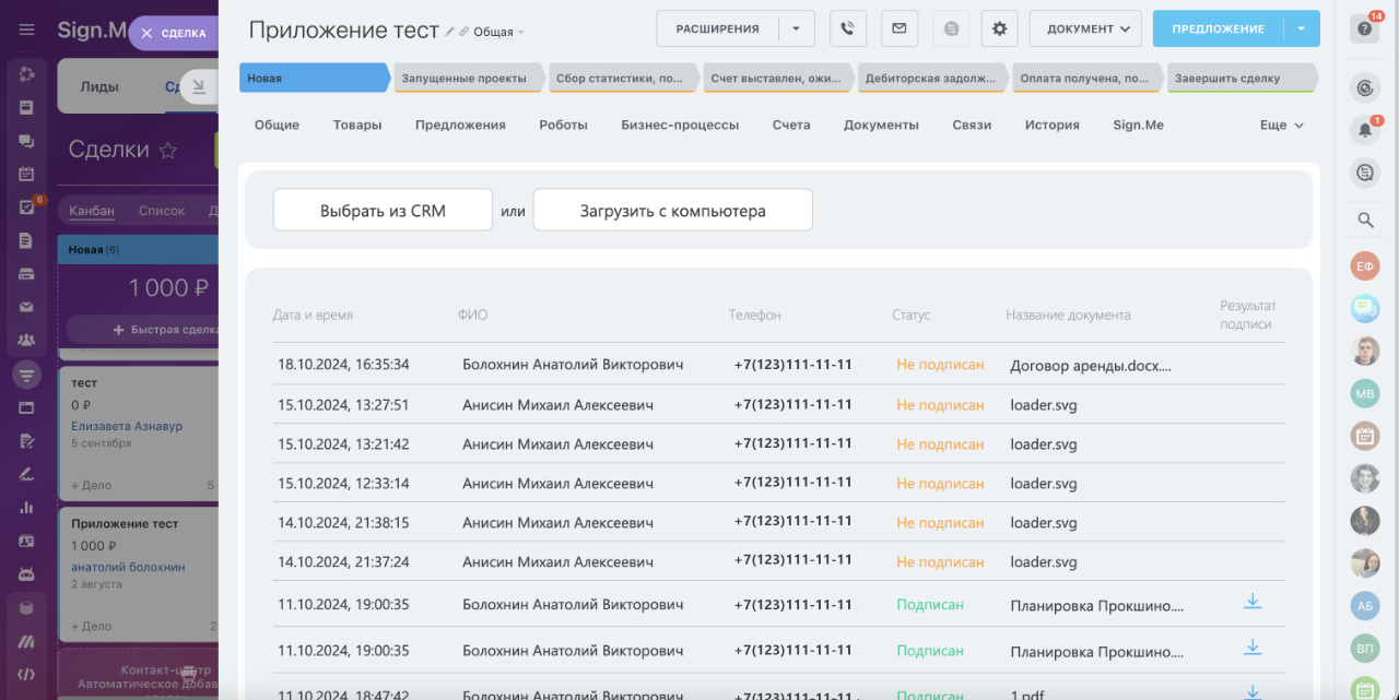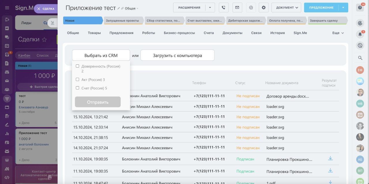 1. Отправить документ на подпись можно из трех сущностей CRM: «Сделки», «Контакты» или «Компании». В каждом из этих разделов вы можете загрузить документ с компьютера или из CRM и в 1 клик отправить вашему контрагенту.