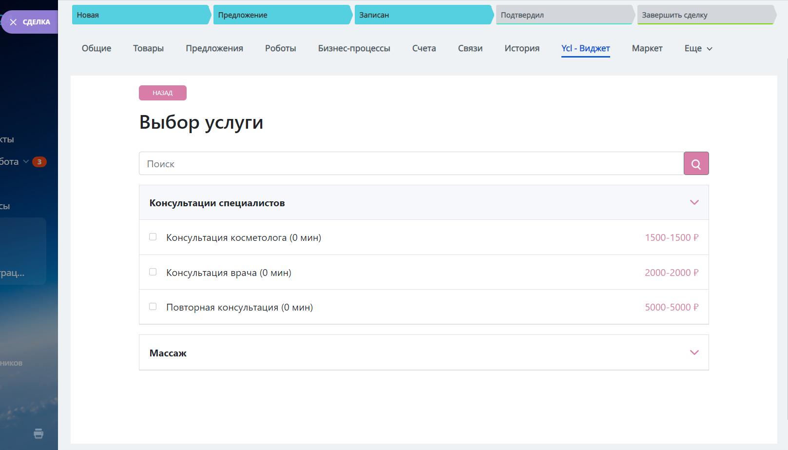 6. Виджет записи позволяет записать клиента на услугу в любой подключенный филиал (клиинику) из сделки Битрикс24. Позволяет выбрать филиал, услугу, специалиста, свободную дату и время. Автоматически подставляются контактные данные клиента из сделки.