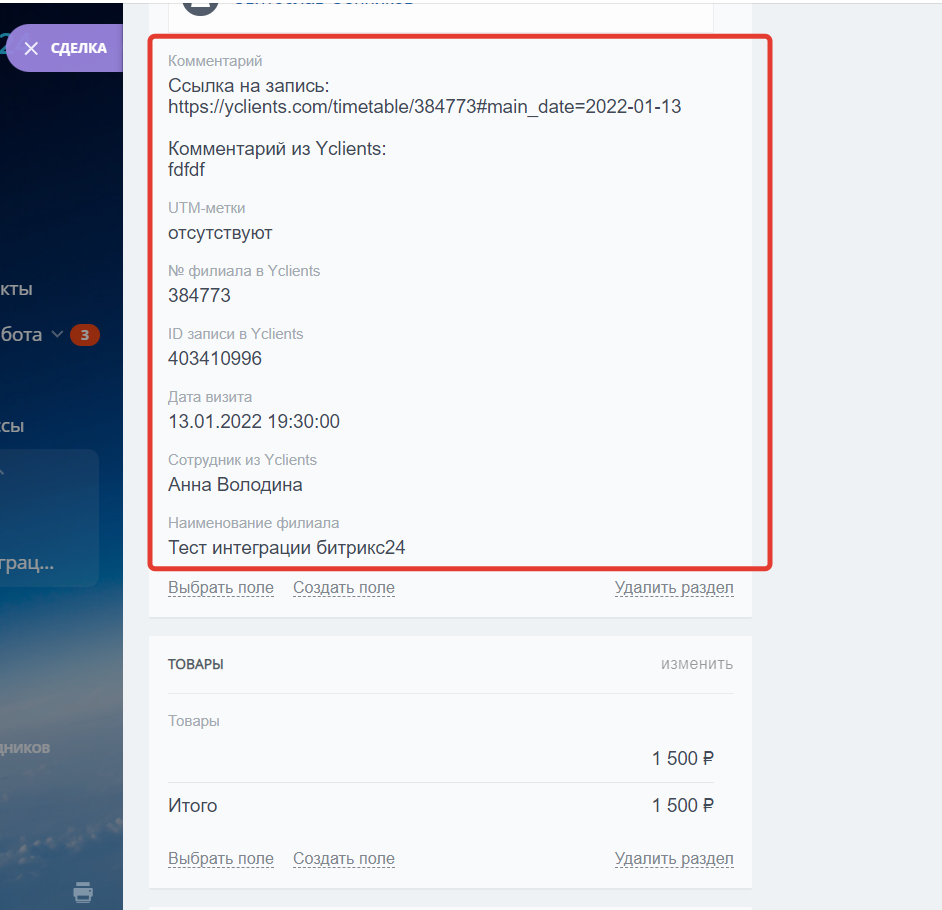 5. В карточку сделки при привязке записи передается: