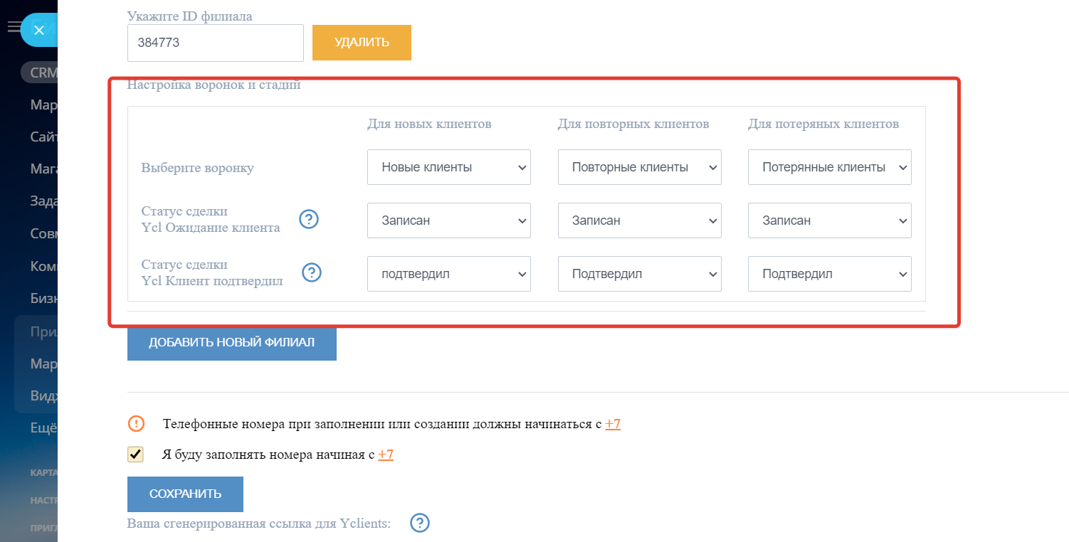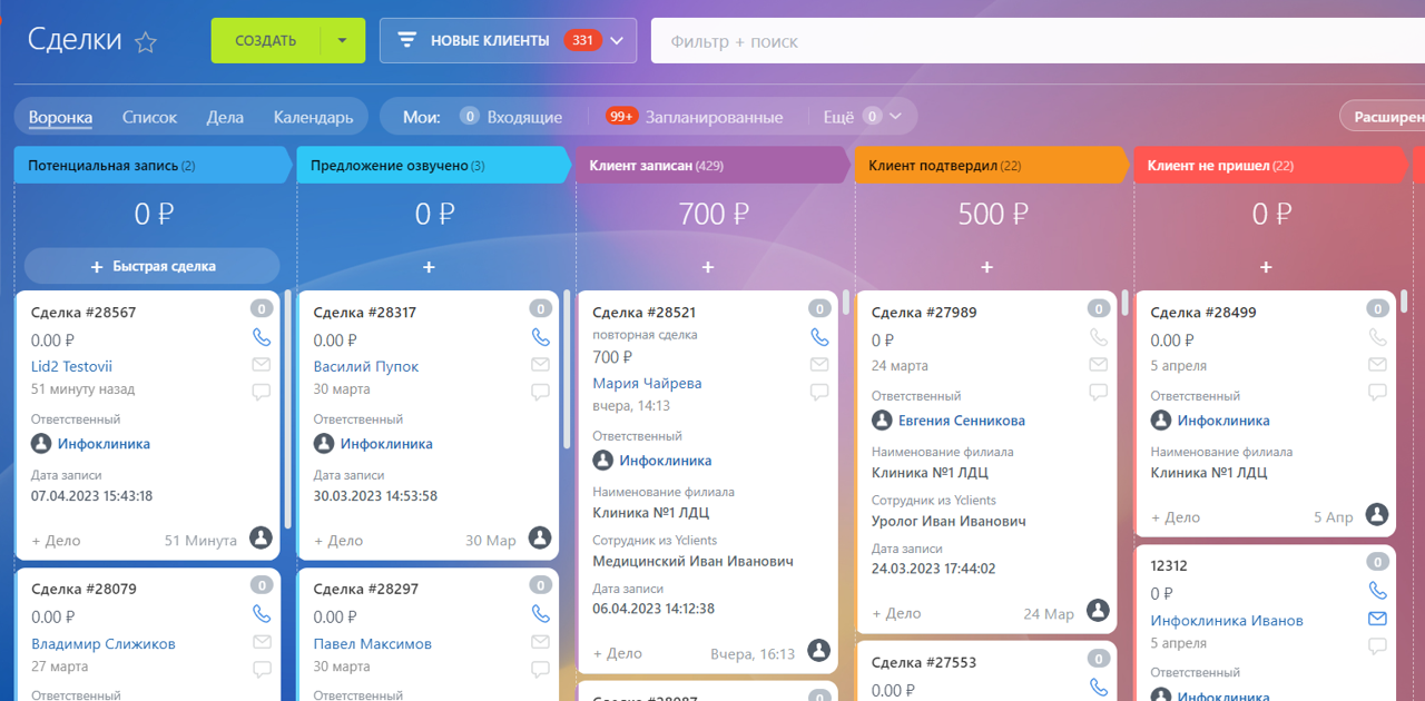 3. При создании записи в сервисе записи создается сделка в правильной воронке Битрикс24 в соответствии с типом клиента: новый, регулярный, потерянный. Вы можете создавать разные сценарии и этапы работы с разными типами клиентов, чтобы довести клиента до записи и составлять отчеты сквозной аналитики.