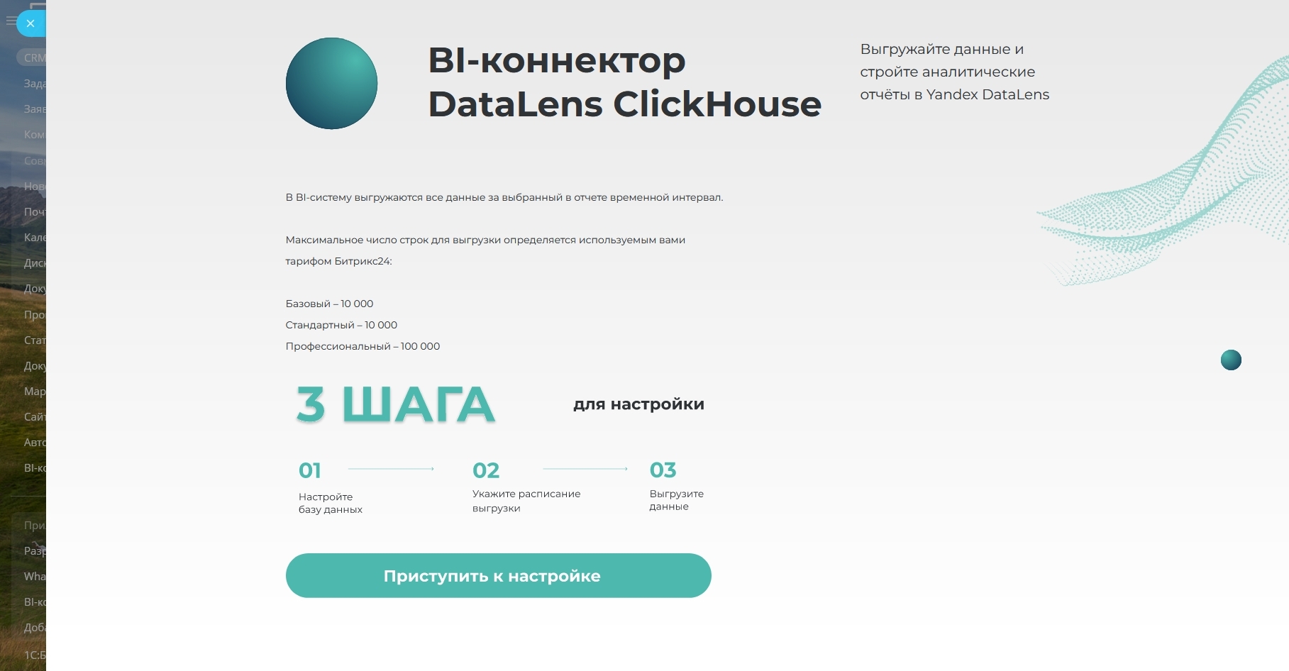 ClickHouse | BI-коннектор Yandex DataLens. Приложение позволяет выгружать данные в Yandex DataLens с помощью стандартного BI-коннектора Битрикс24 и строить бизнес-отчёты для принятия решений на основе данных.