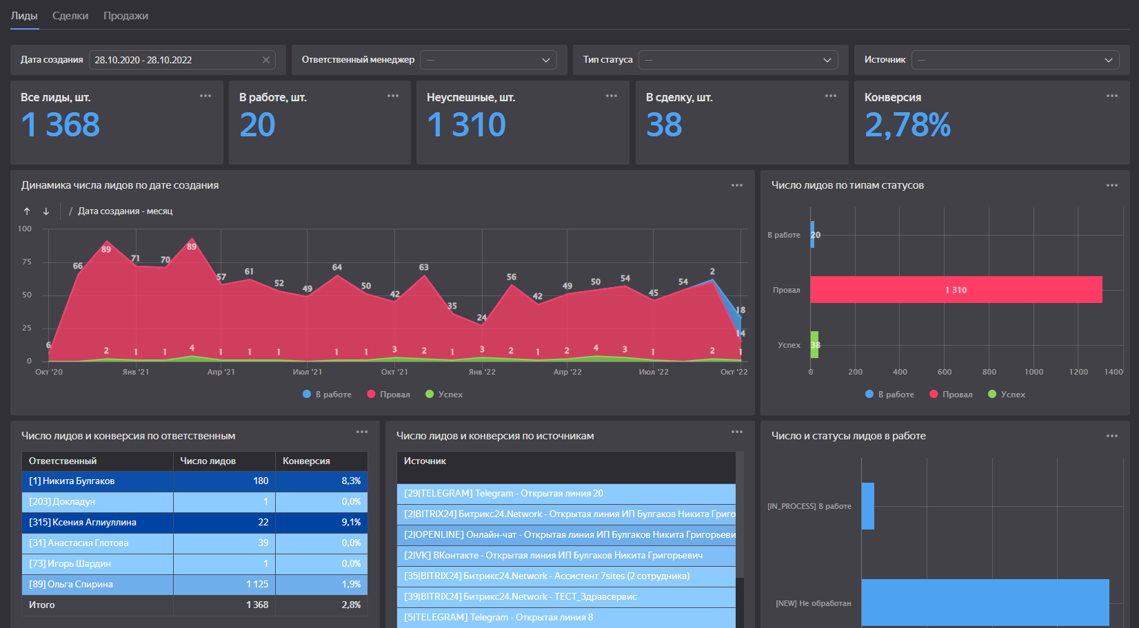 С помощью приложения для построения аналитических отчётов в Yandex DataLens можно передавать лиды, сделки, контакты, компании, звонки.