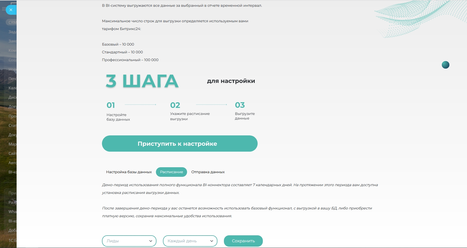 Демо-период, когда доступен функционал установки расписания выгрузки данных для анализа - составляет 7 календарных дней.