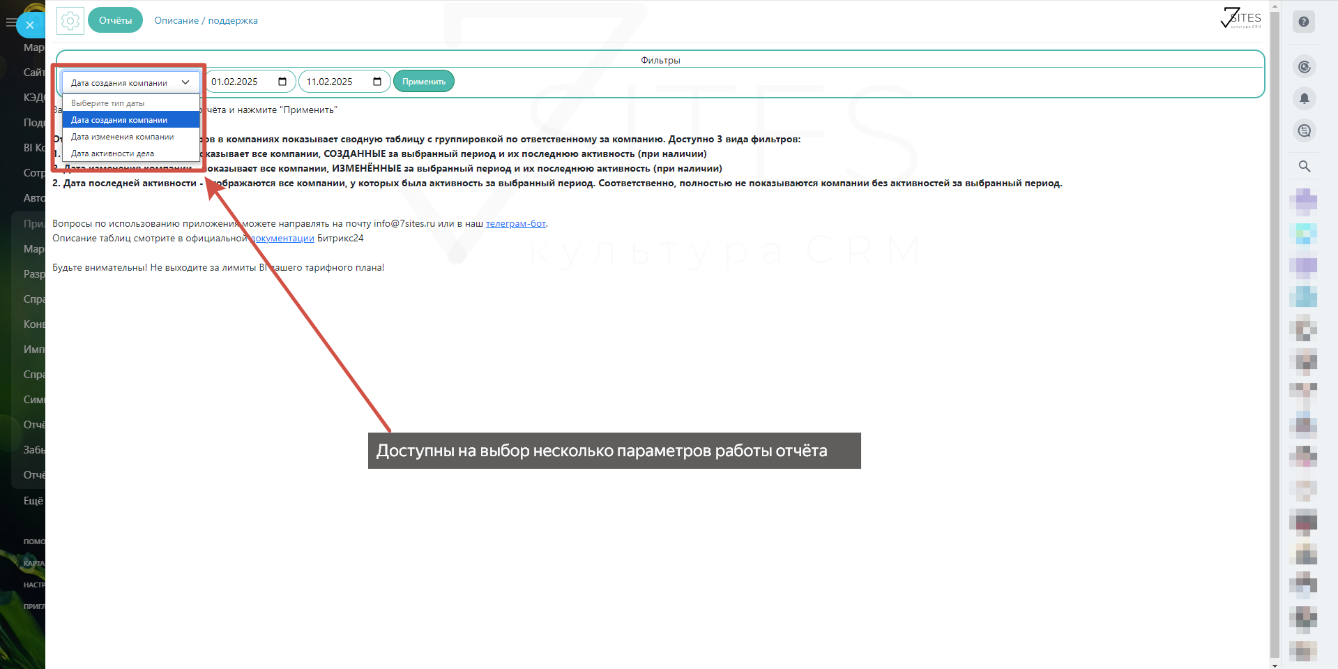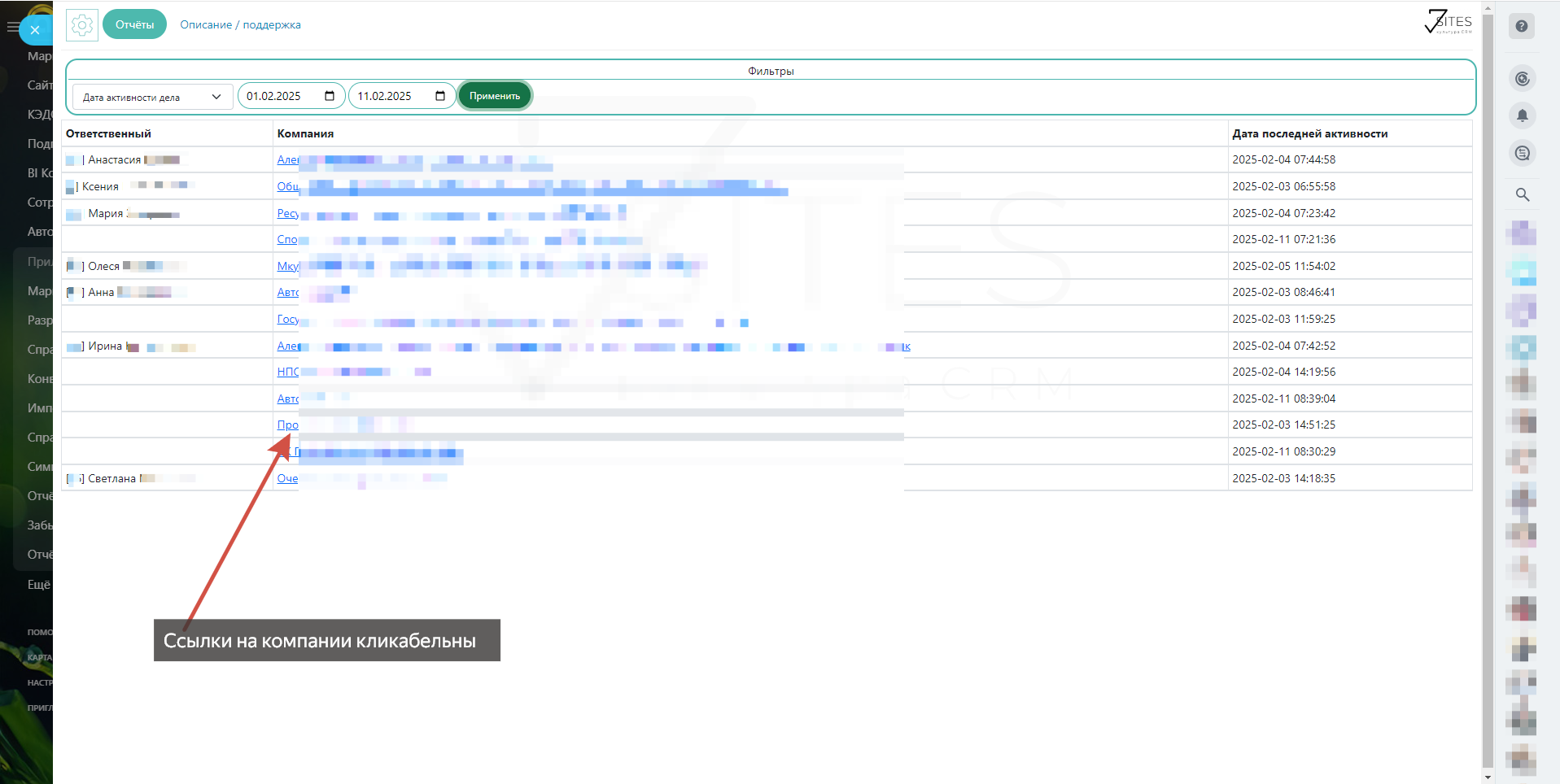 Дата последней активности — фокусируется только на компаниях с активностью в выбранном интервале. Компании без действий за период автоматически исключаются.