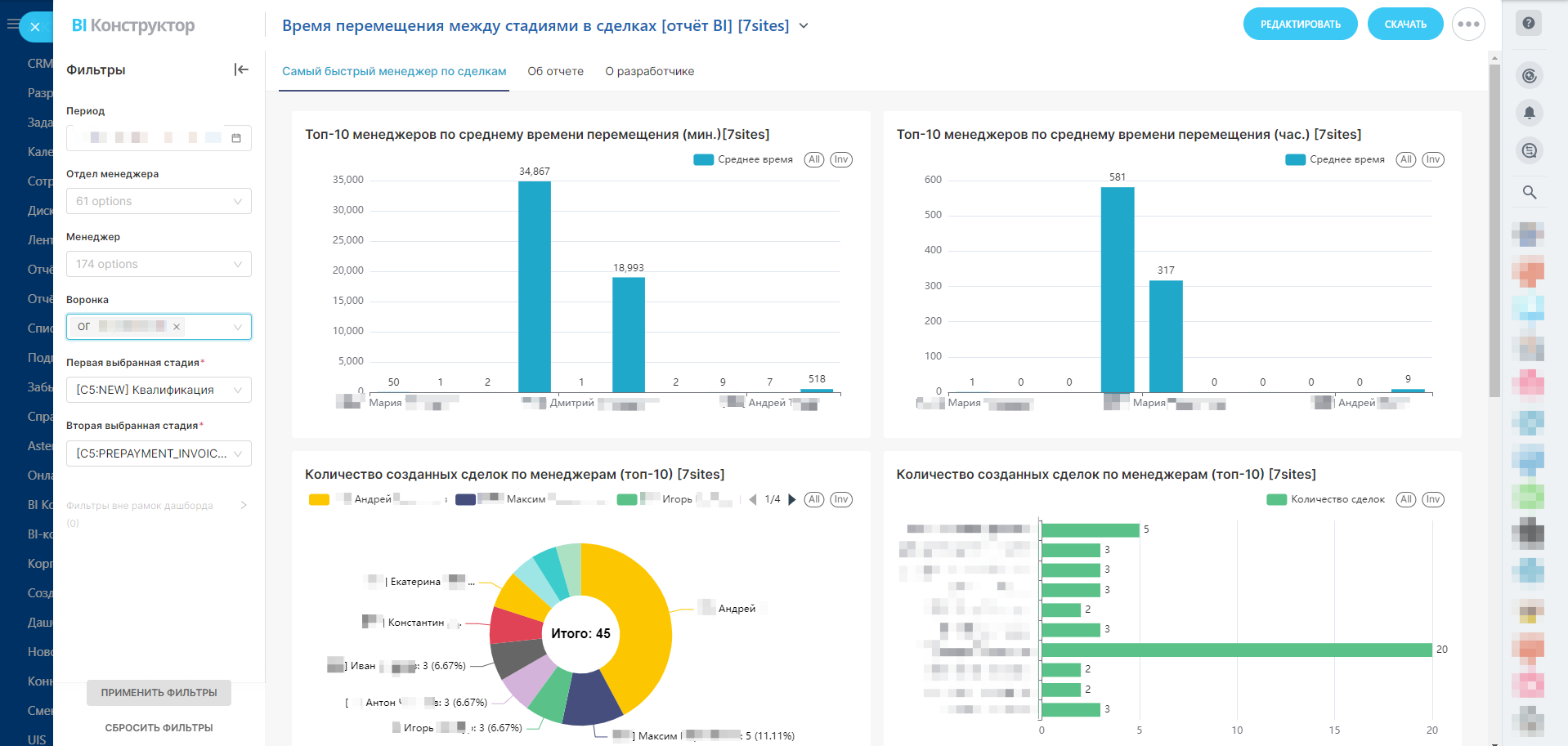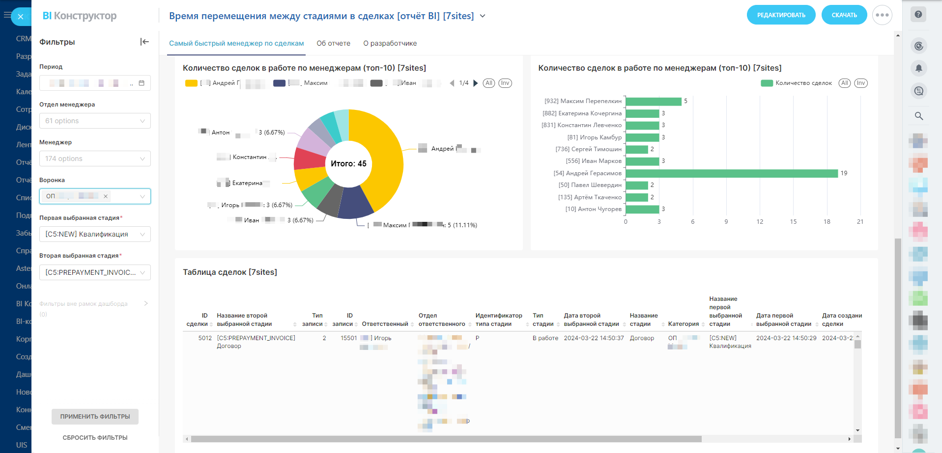 1. Топ-10 менеджеров по среднему времени перемещения (мин.). То есть, сколько времени в среднем требуется менеджеру на перемещение между выбранными стадиями сделки в минутах. Показываются первые 10 самых быстрых менеджеров.