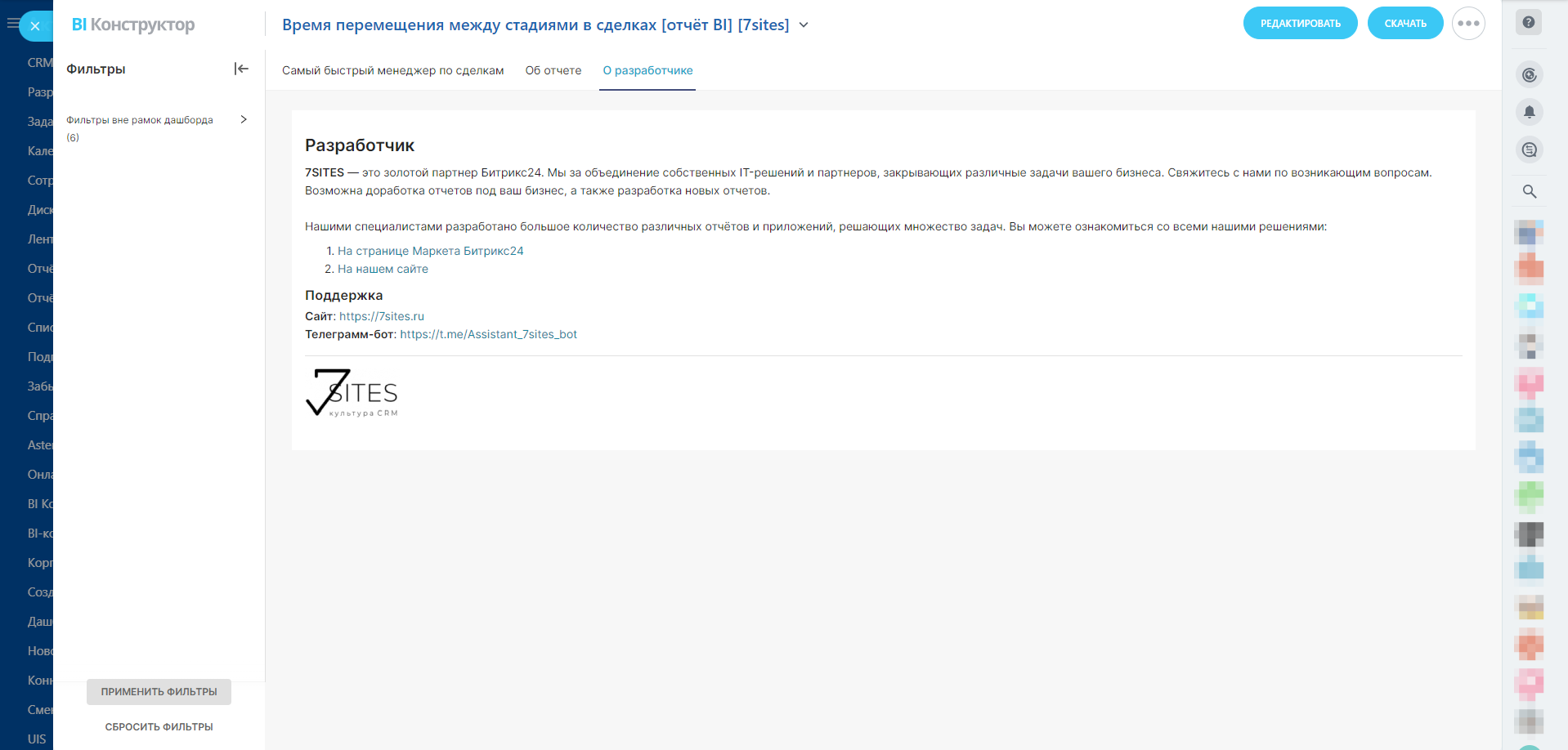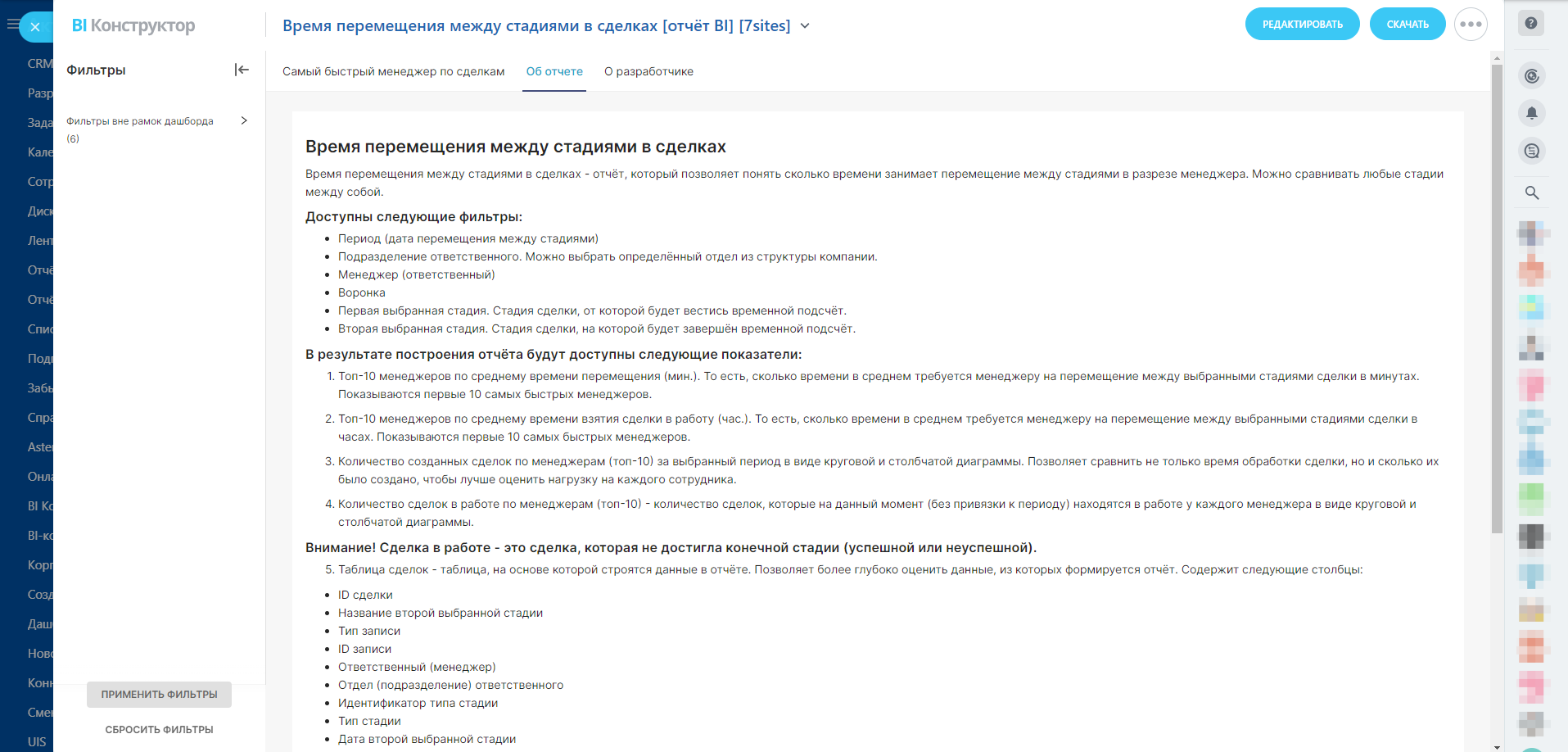 Время перемещения между стадиями в сделках - отчёт, который позволяет понять сколько времени занимает перемещение между стадиями в разрезе менеджера. Можно сравнивать любые стадии между собой.