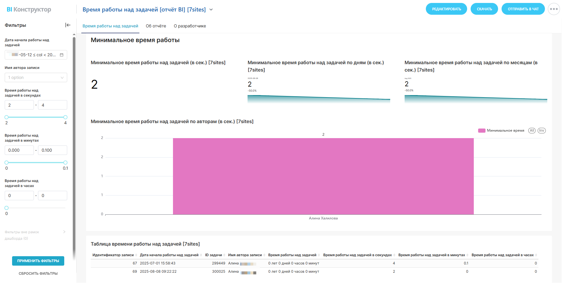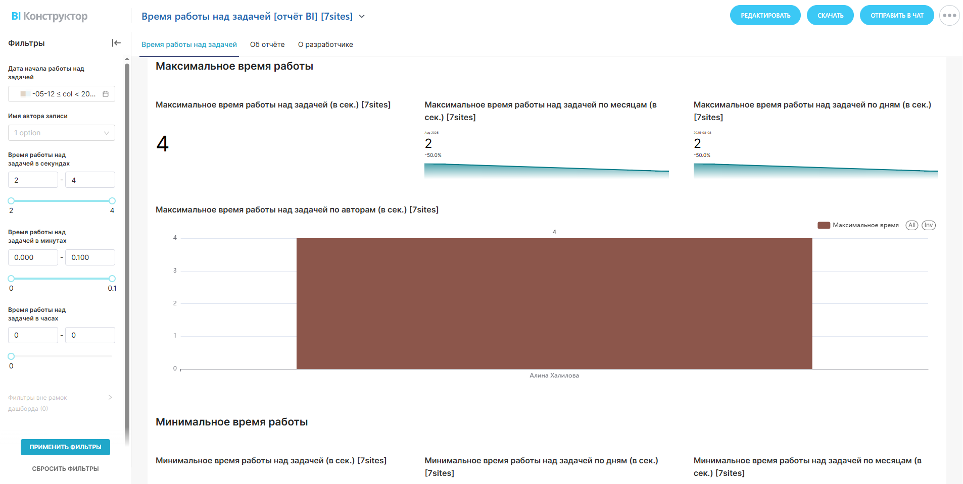 Минимальное время работы над задачей (в сек.) - Минимальное время, затраченное на выполнение одной задачи. Этот показатель помогает выявить задачи, которые были выполнены быстро.