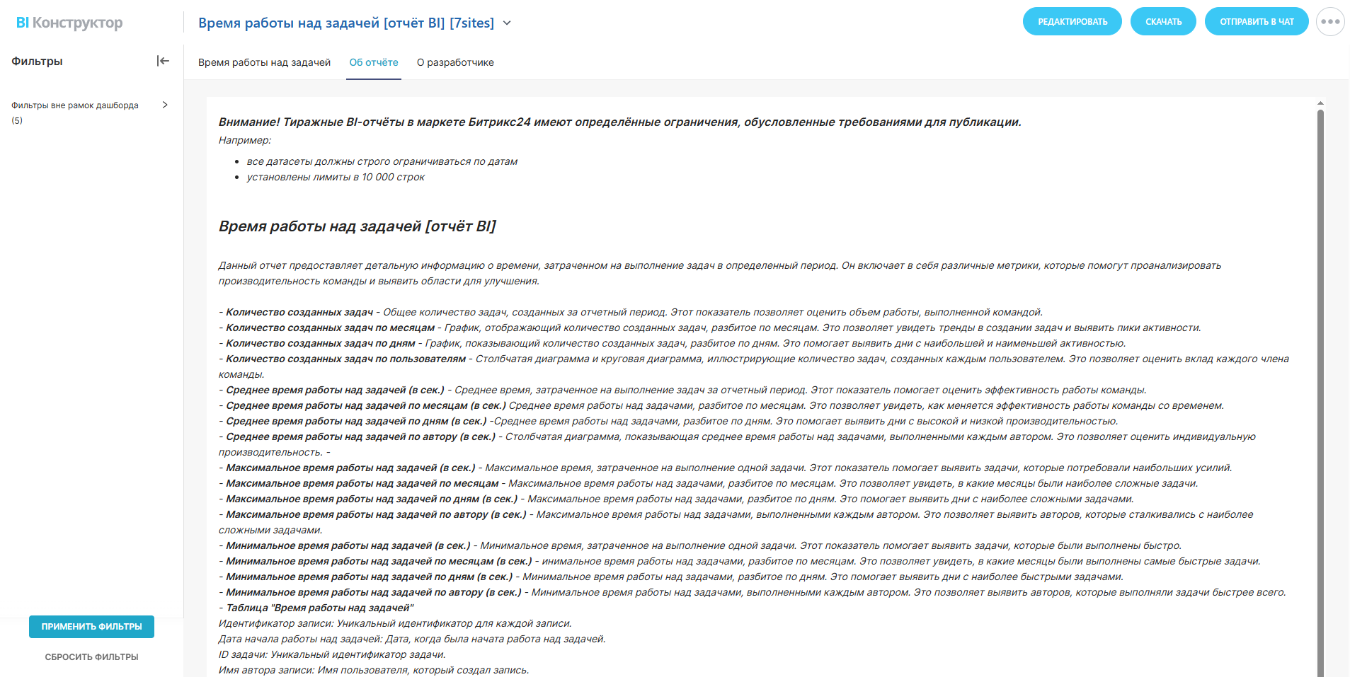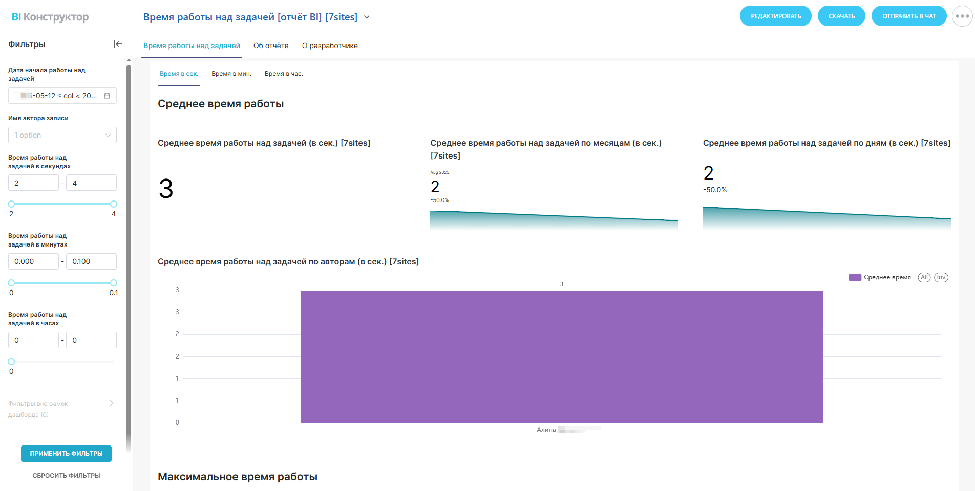 Среднее время работы над задачей (в сек.) - Среднее время, затраченное на выполнение задач за отчетный период. Этот показатель помогает оценить эффективность работы команды.