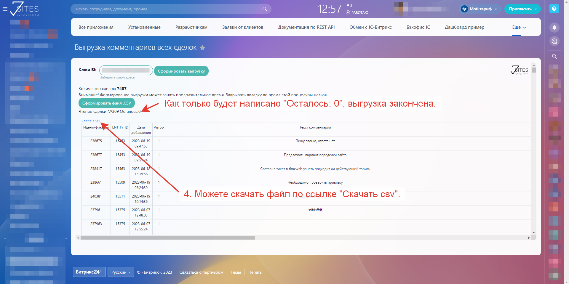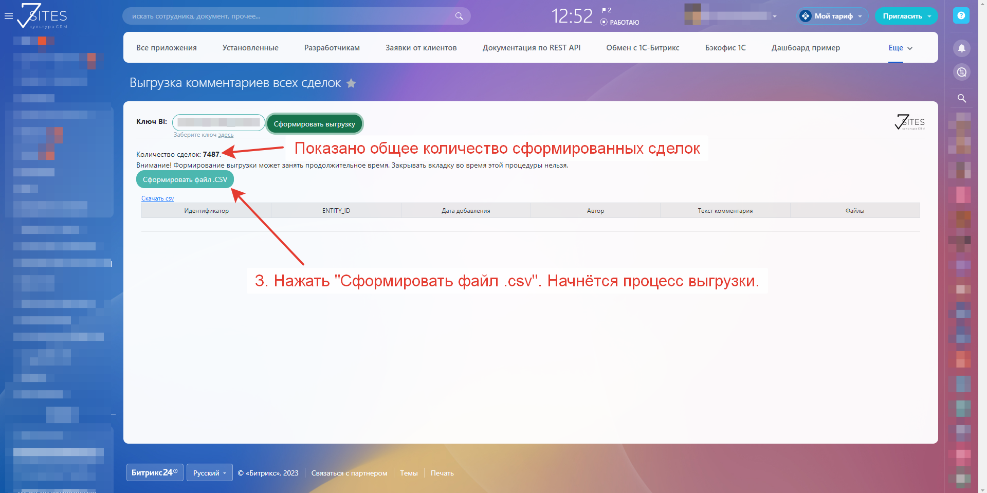 Приложение позволяет выгружать комментарии из всех сделок в файл .csv для последующего анализа.