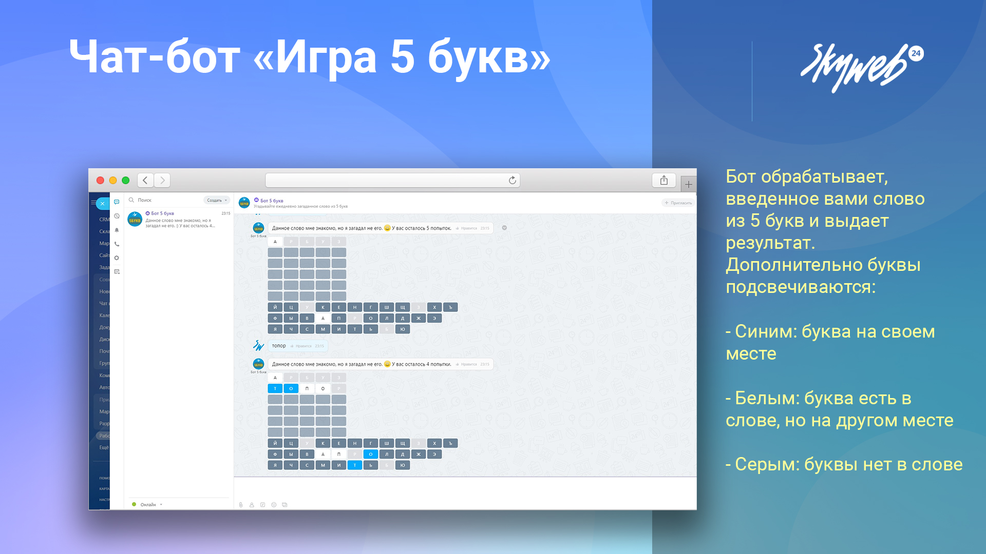 В стандартной CRM Битрикс24 нет встроенных развлекательных игр для сотрудников. "Игра 5 букв" от Скайвеб24 решает эту проблему, предлагая увлекательную и познавательную игру для тренировки мозга и улучшения логических навыков. Ежедневное обновление со словом для отгадывания помогает поддерживать интерес и стимулирует участие в межсерверных соревнованиях.