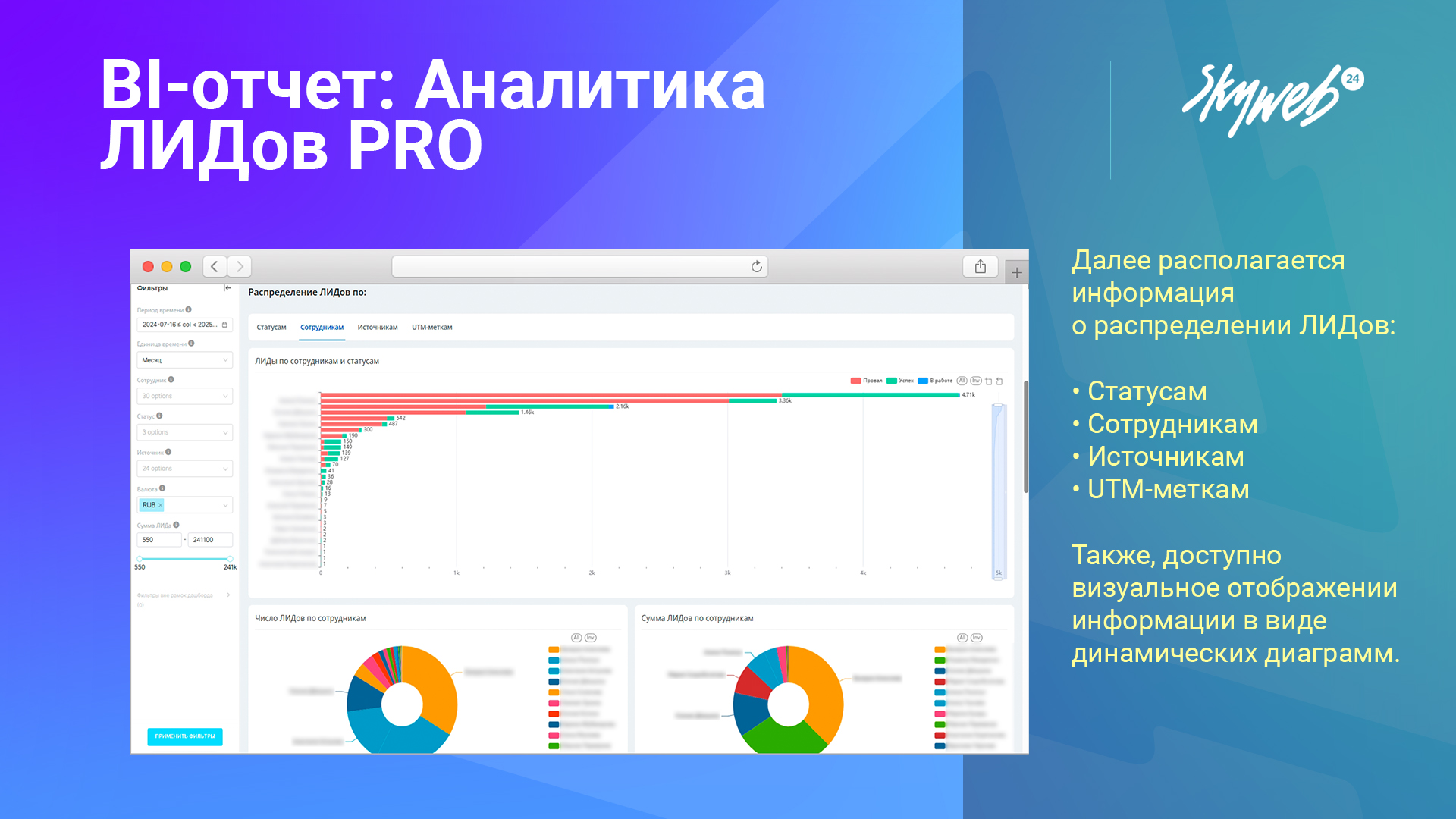 Распределение лидов по статусам, рекламным каналам, сотрудникам