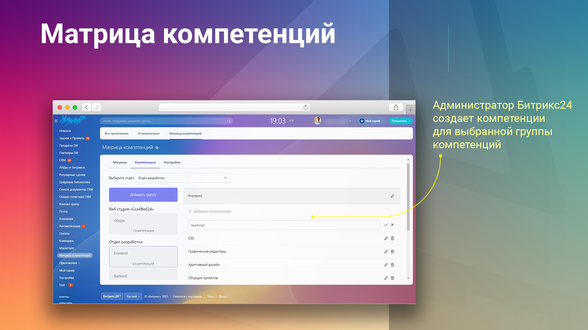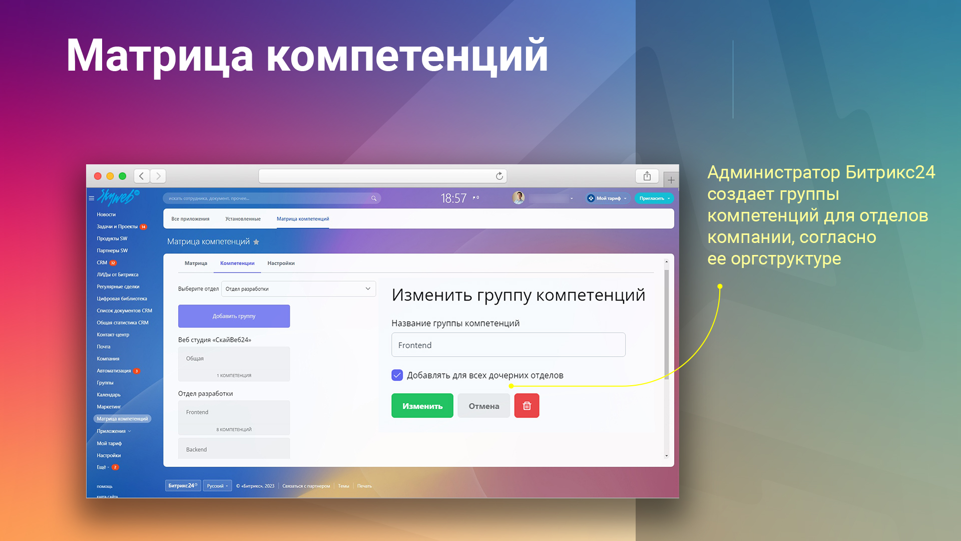Администратор создает группы компетенций для отделов компании. Группы могут быть доступны и для подразделений отделов. Добавление неограниченного количества компетенций.