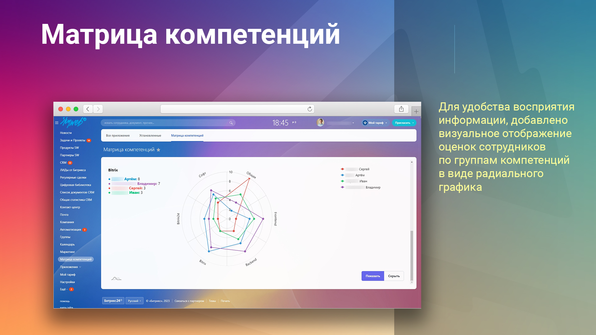 Следите за компетенциями сотрудников по отделам компании в удобном графическом и табличном виде с приложением "Матрица компетенций"!