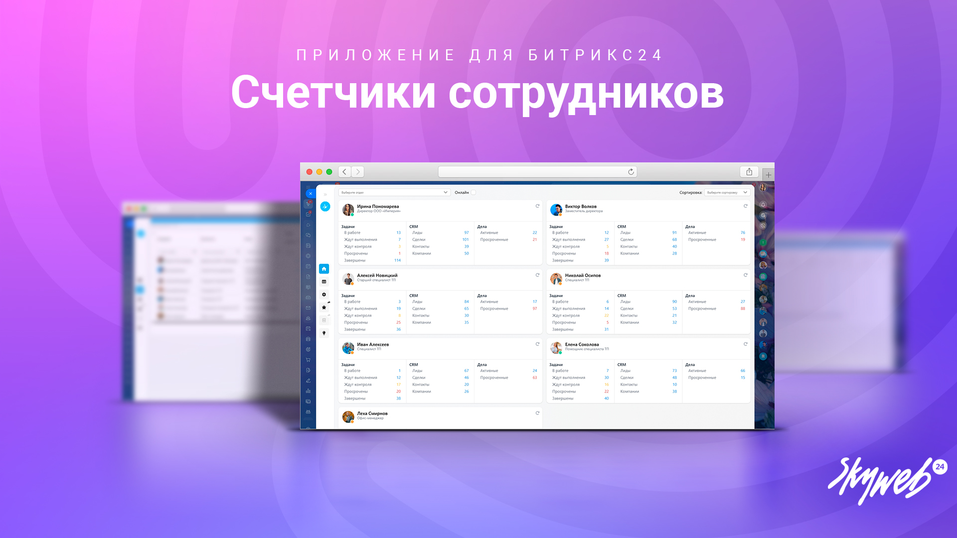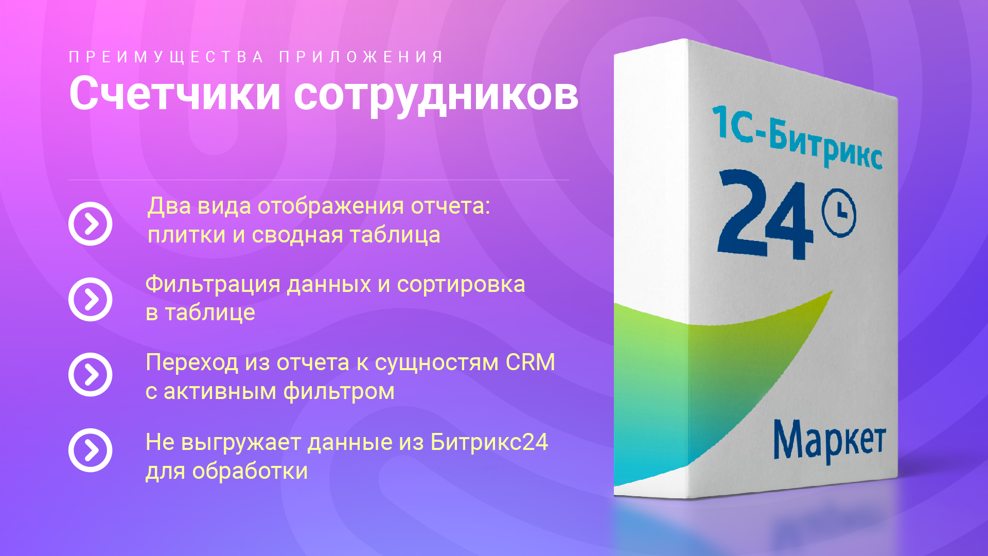 Приложение «Счетчики сотрудников» собирает и анализирует данные по задачам, CRM-сущностям и делам в Битрикс24. Вы сами выбираете, какие объекты и статусы учитывать, видите ключевые показатели команды в удобном виде и переходите к деталям одним кликом.
