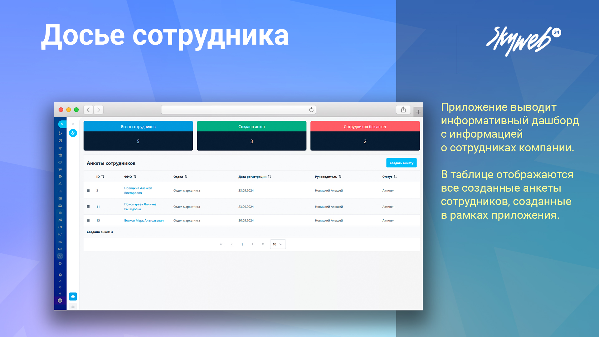 Приложение «Досье сотрудника» — мощный инструмент для руководителей, который позволяет создавать и заполнять анкеты сотрудников. Это помогает руководителям лучше понимать своих подчиненных, их сильные и слабые стороны, а также фиксировать важные моменты взаимодействий.