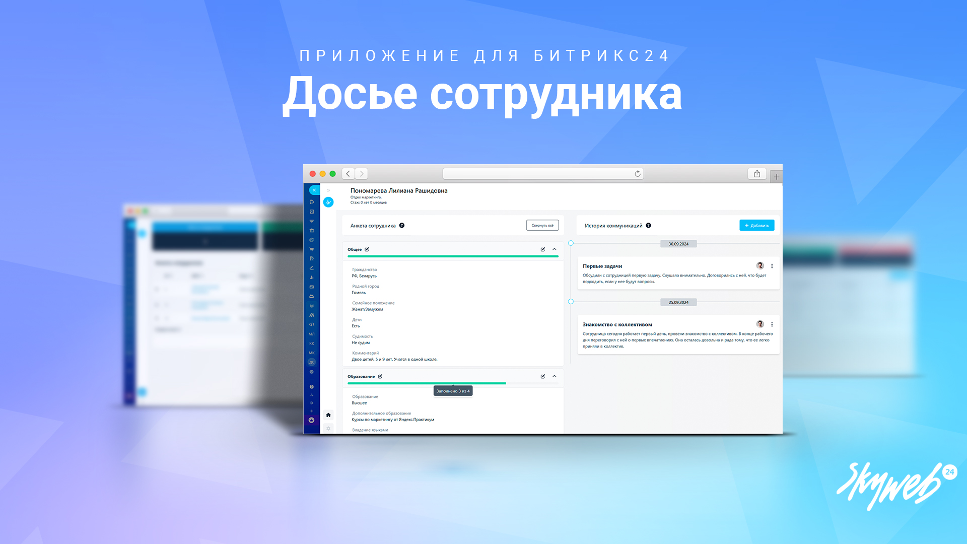 В стандартной CRM Битрикс24 нет удобного способа для записи и хранения информации о сотрудниках, а также, фиксации результатов коммуникаций. "Досье сотрудника" от Скайвеб24 решает эту проблему, предоставляя инструмент для создания и заполнения анкет сотрудников, что помогает лучше понять их сильные и слабые стороны и фиксировать важные моменты взаимодействий.