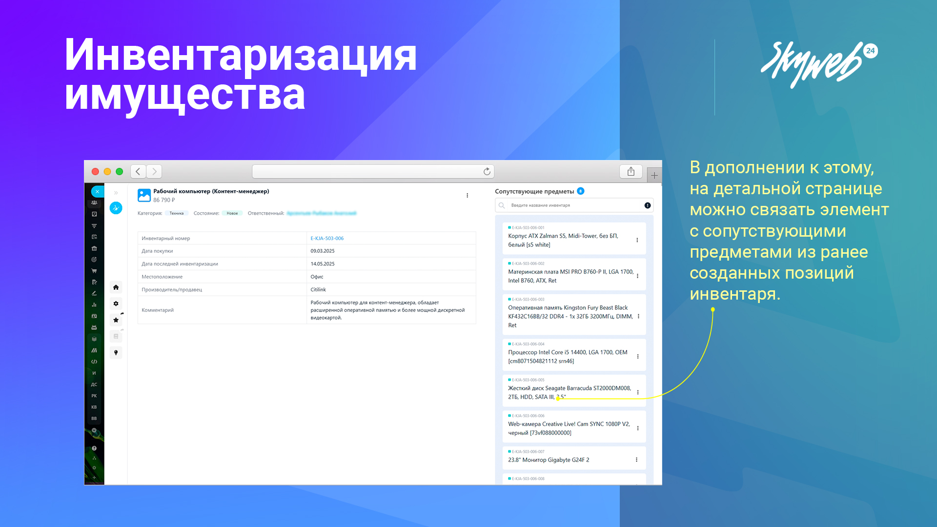 Наше приложение позволяет вести учет всего инвентаря – от канцелярии и аксессуаров до серверного оборудования и офисной мебели – посредством удобного интерфейса и гибких связей между объектами.