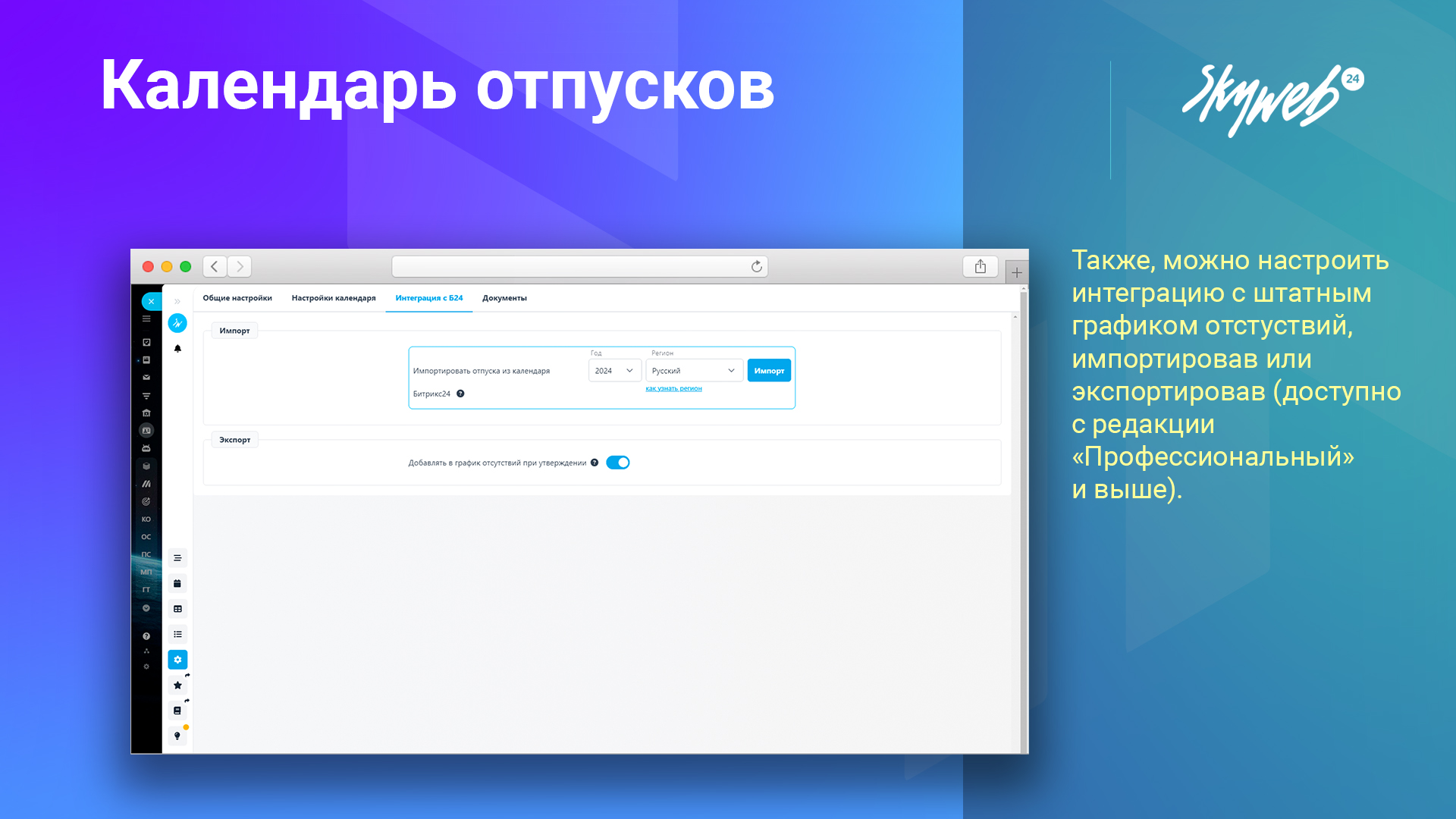 Для владельцев порталов с подпиской «Профессиональный» и выше доступна функция импорта и экспорта отпусков и иных причин отсутствия в штатный график отсутствий, а также, отображение кнопки синхронизации календарей приложения и Битрикс24.