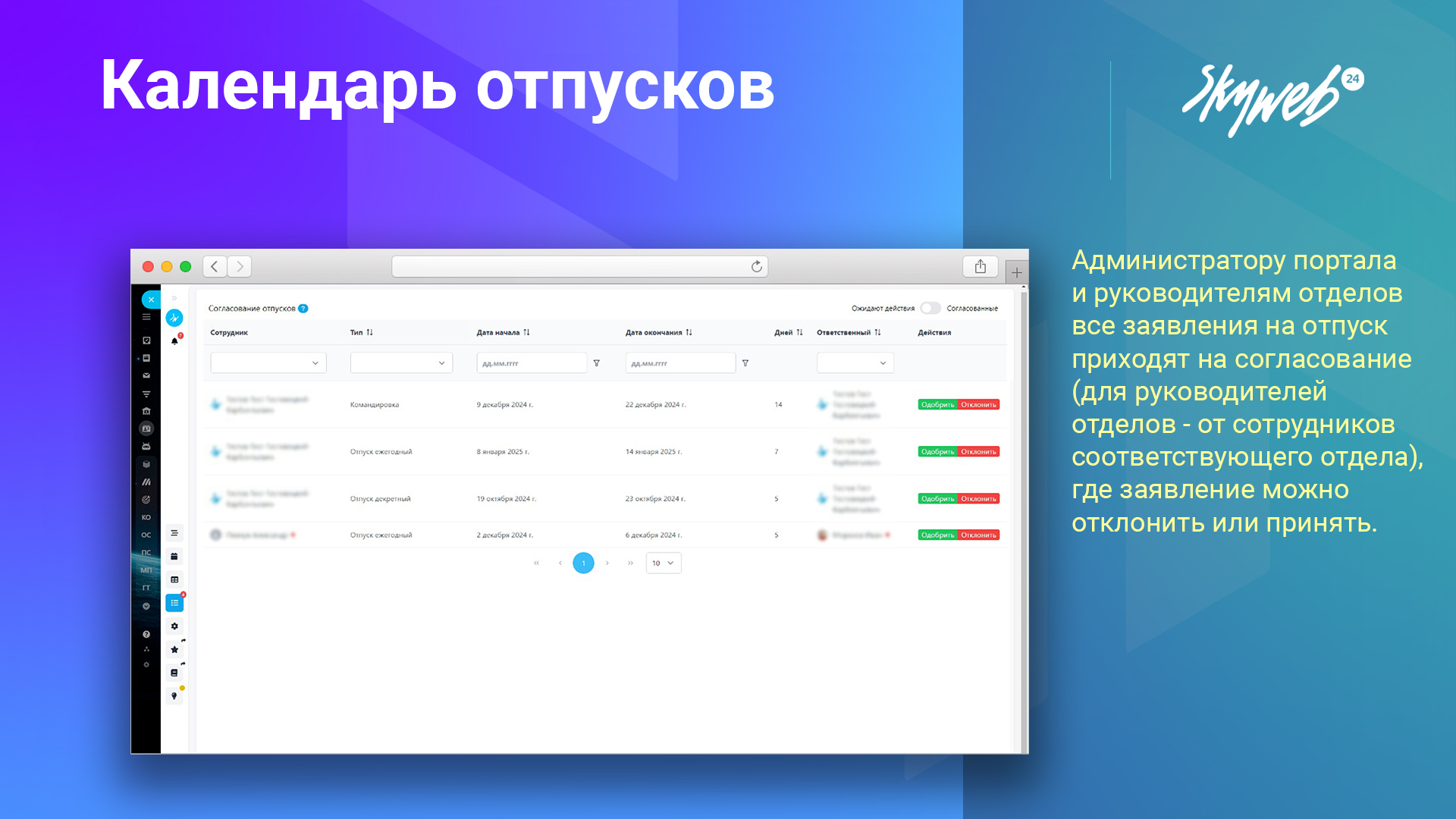 Руководителям отделов все заявления на отпуск приходят на согласование на отдельную страницу в приложении, где заявление можно отклонить или принять.