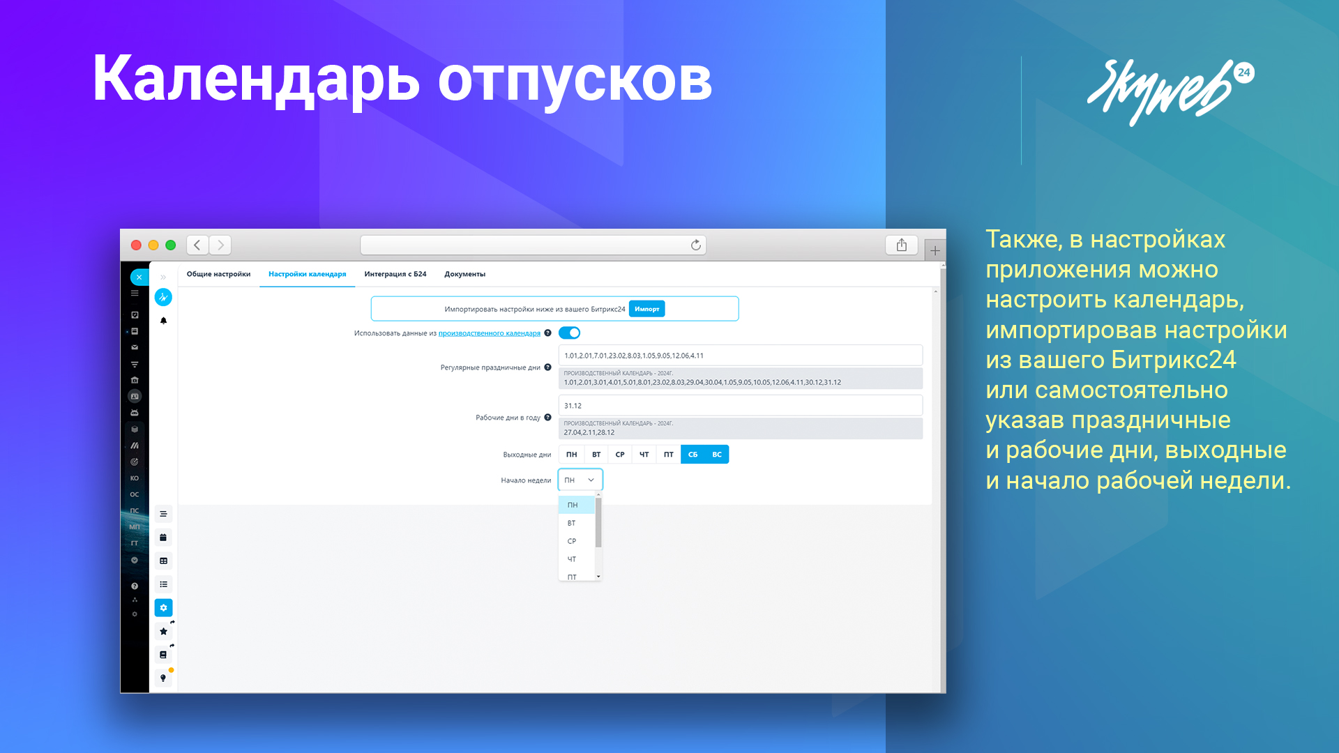 ✅ Во вкладке «Настройки календаря» можно настроить календарь, импортировав настройки из вашего Битрикс24, а также активировав использование данных из производственного календаря. Кроме того, можно самостоятельно указать праздничные и рабочие дни, выходные и начало рабочей недели.