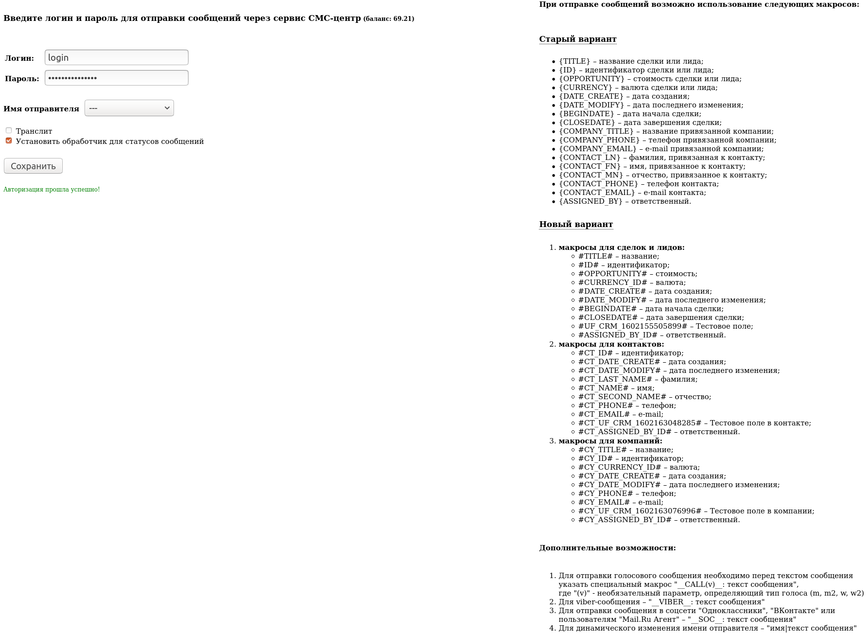 Приложение позволяет отправлять сообщения из бизнес-процессов, роботов и карточек CRM через сервис СМС-центр.