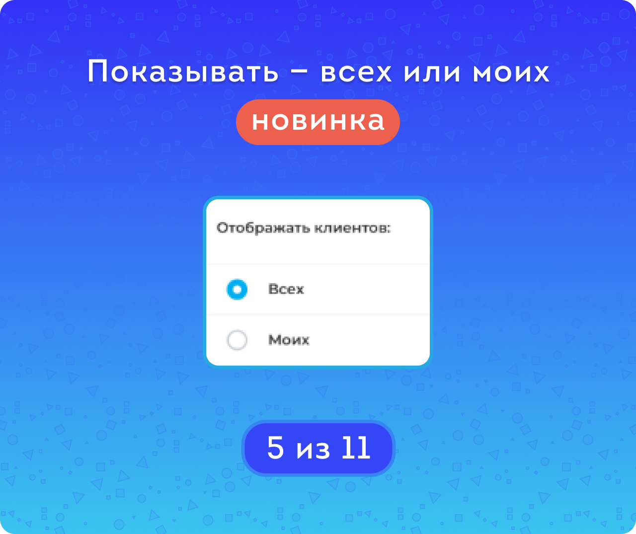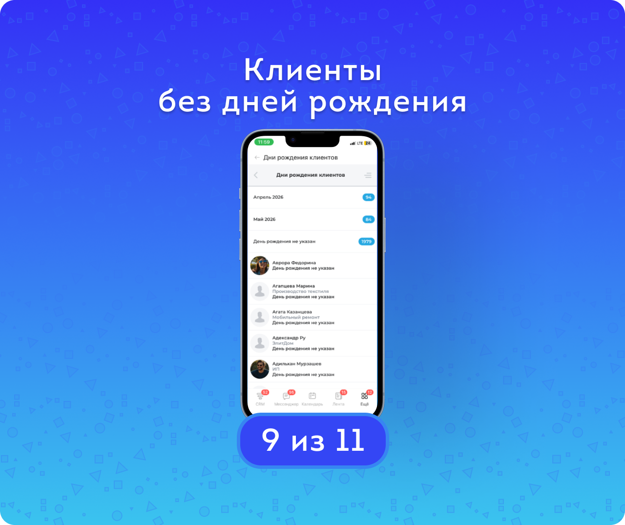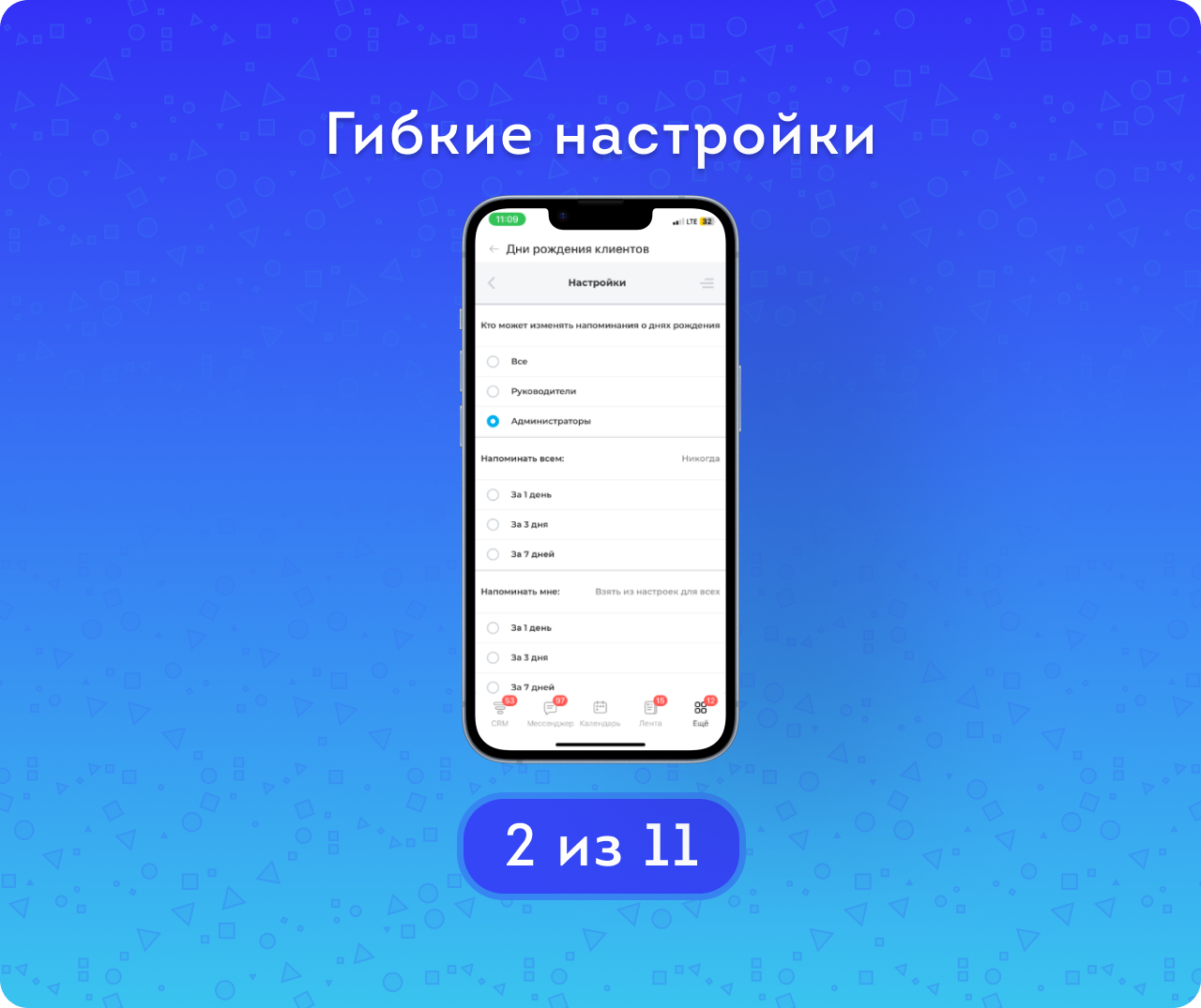 - Настройка отображения: возможность выбрать, чьи дни рождения отображать в приложении: всех клиентов или только «своих» — тех, за кого сотрудник назначен ответственным. Эта настройка индивидуальна для каждого пользователя и влияет только на отображение данных. Важно: уведомления при этом приходят по всем доступным контактам — в соответствии с правами доступа, независимо от выбранного режима отображения.