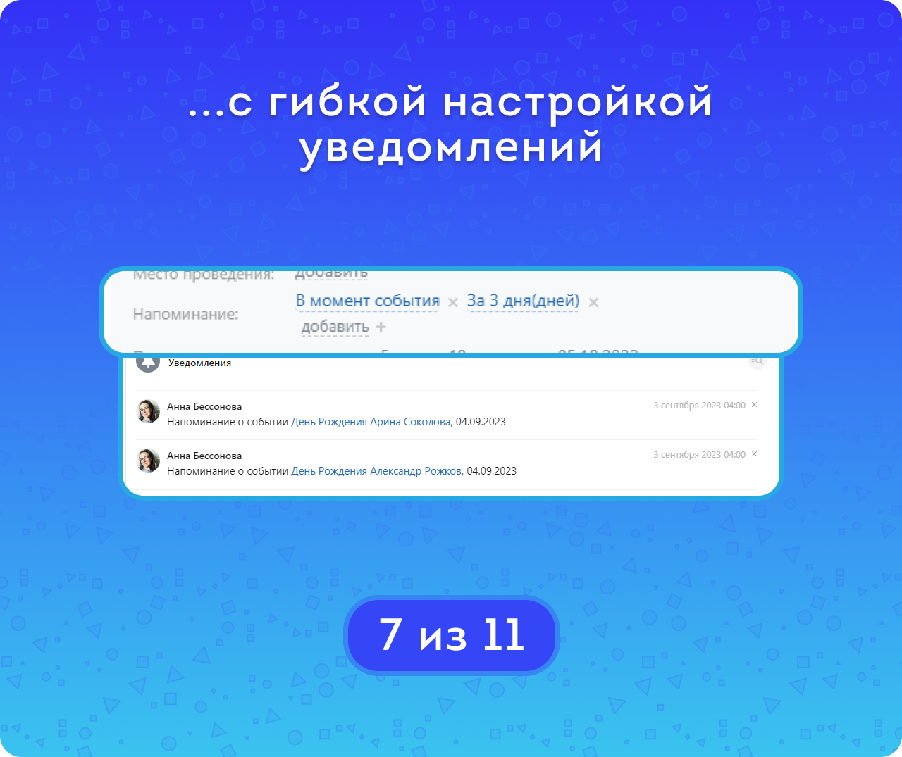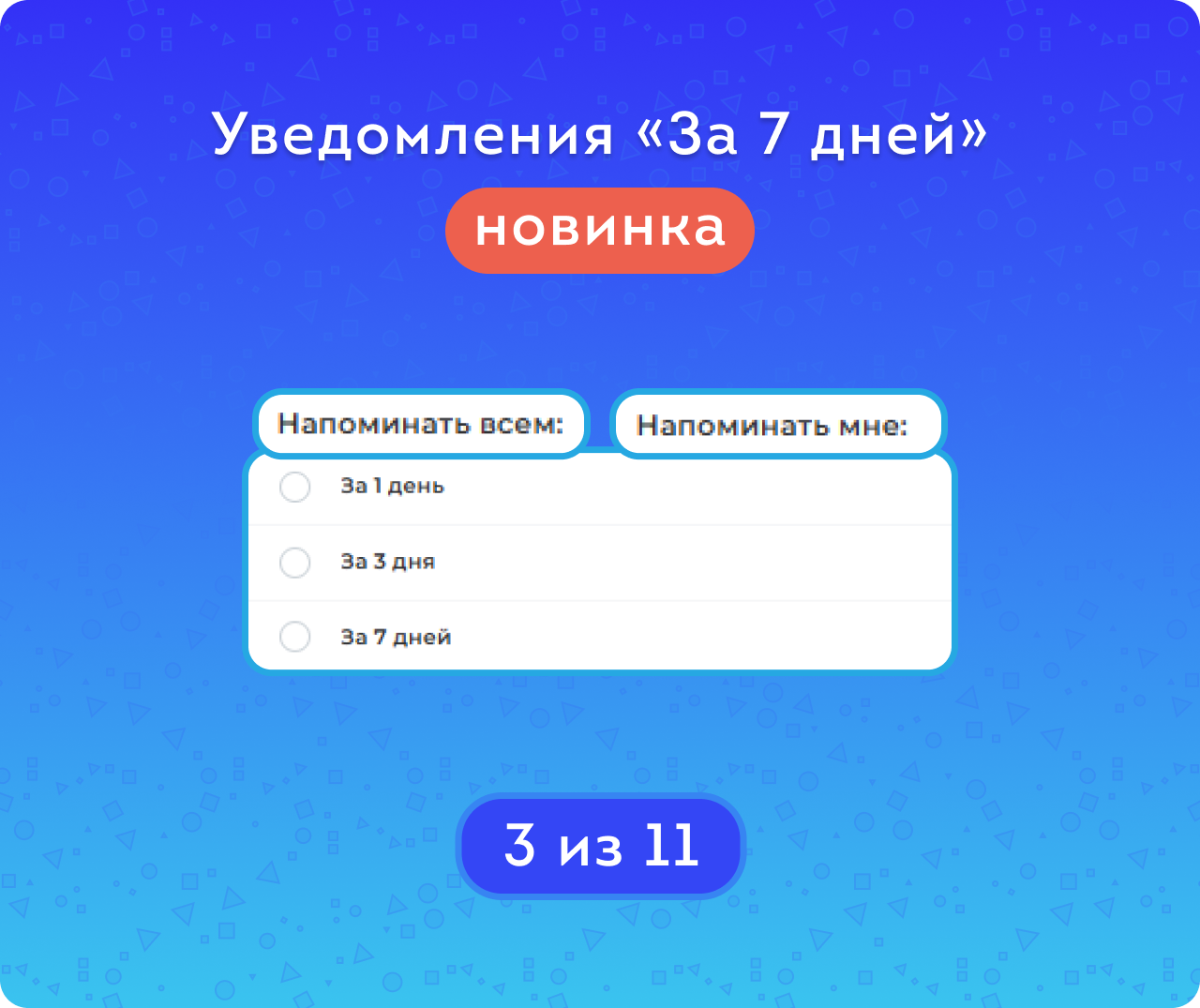 Пример: если выбрать «администраторы» и «за 3 дня», то все сотрудники будут получать напоминания за 3 дня до события и не смогут изменить эти настройки. Администратор же сможет настроить напоминания для себя отдельно — например, совсем их отключить или выбрать другую периодичность.