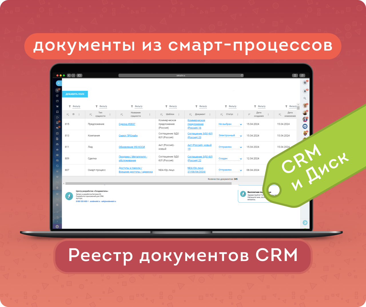 В любой компании со временем накапливается большое количество документов: договоры, счета, акты, накладные, приказы, доверенности и так далее. Документы отображаются в карточке сущности CRM, но общий список не посмотреть, поэтому создать документ по шаблону легко, а вот найти его потом намного сложнее. Зачастую, чтобы найти один-единственный документ, приходится посетить множество страниц портала и потратить уйму времени.