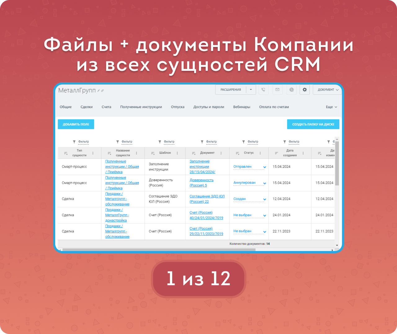 — Встройка в Лида, Сделку и Компанию, которая показывает документы и в дочерних сущностях (Контакты, Счета и Предложения).
