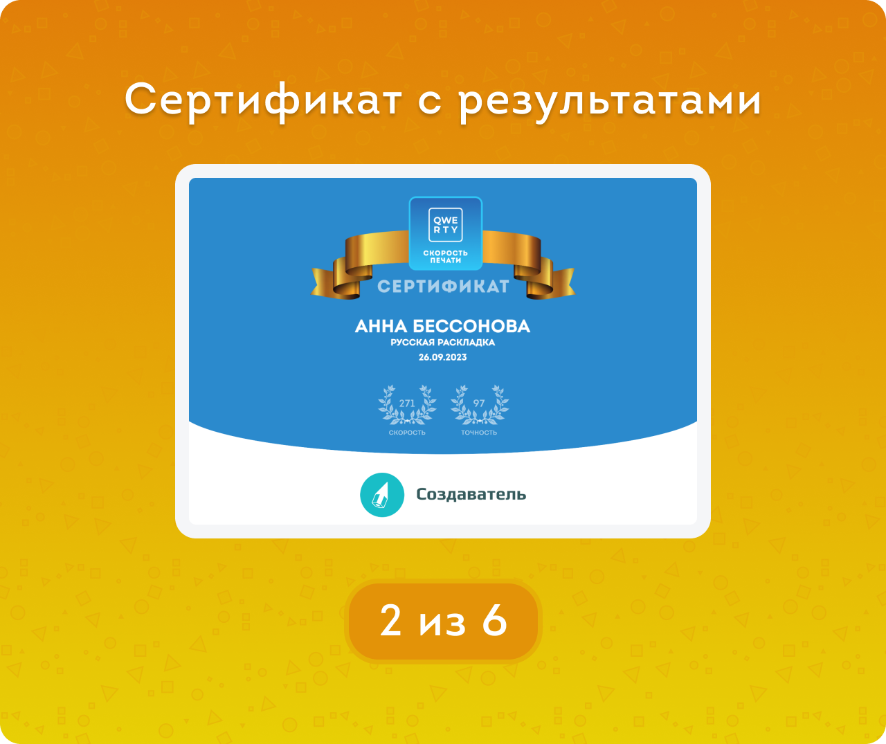 Тест скорости можно проходить сколько угодно раз, а в сертификате учитываются ваши лучшие результаты. Готовый сертификат можно скачать в формате pdf. На основании прохождения теста также формируется рейтинг сотрудников, в которых учитывается лучшая скорость, а также выводится общий прогресс прохождения курса.
