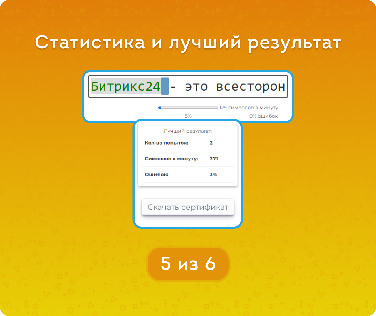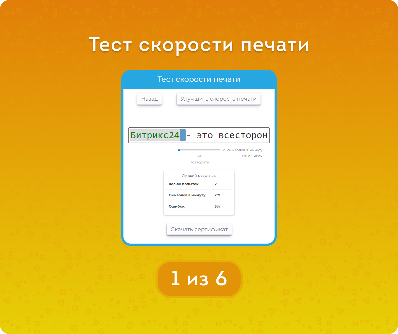 Для дополнительной тренировки и проверки себя — пройдите тест скорости печати. В нем рандомно будут выбираться сложные предложения (связанные с тематикой Битрикс24). Тест позволит оценить, насколько хорошо и быстро вы научились печатать после прохождения курса. Оцениваются скорость и точность, на основании них пользователь получает сертификат. Для интереса можно пройти тест до и после прохождения полного курса — и оценить разницу!