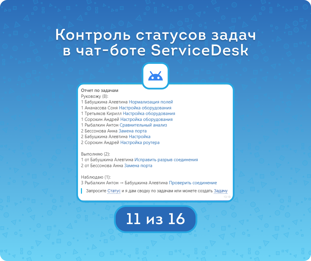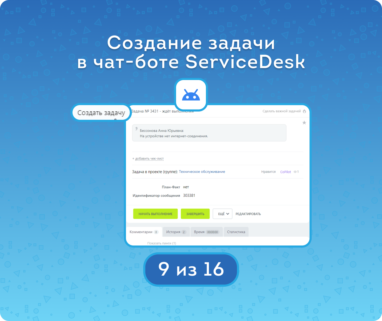 В чат-боте можно создать новую задачу или отследить статус уже поставленных задач, используя соответствующие команды.