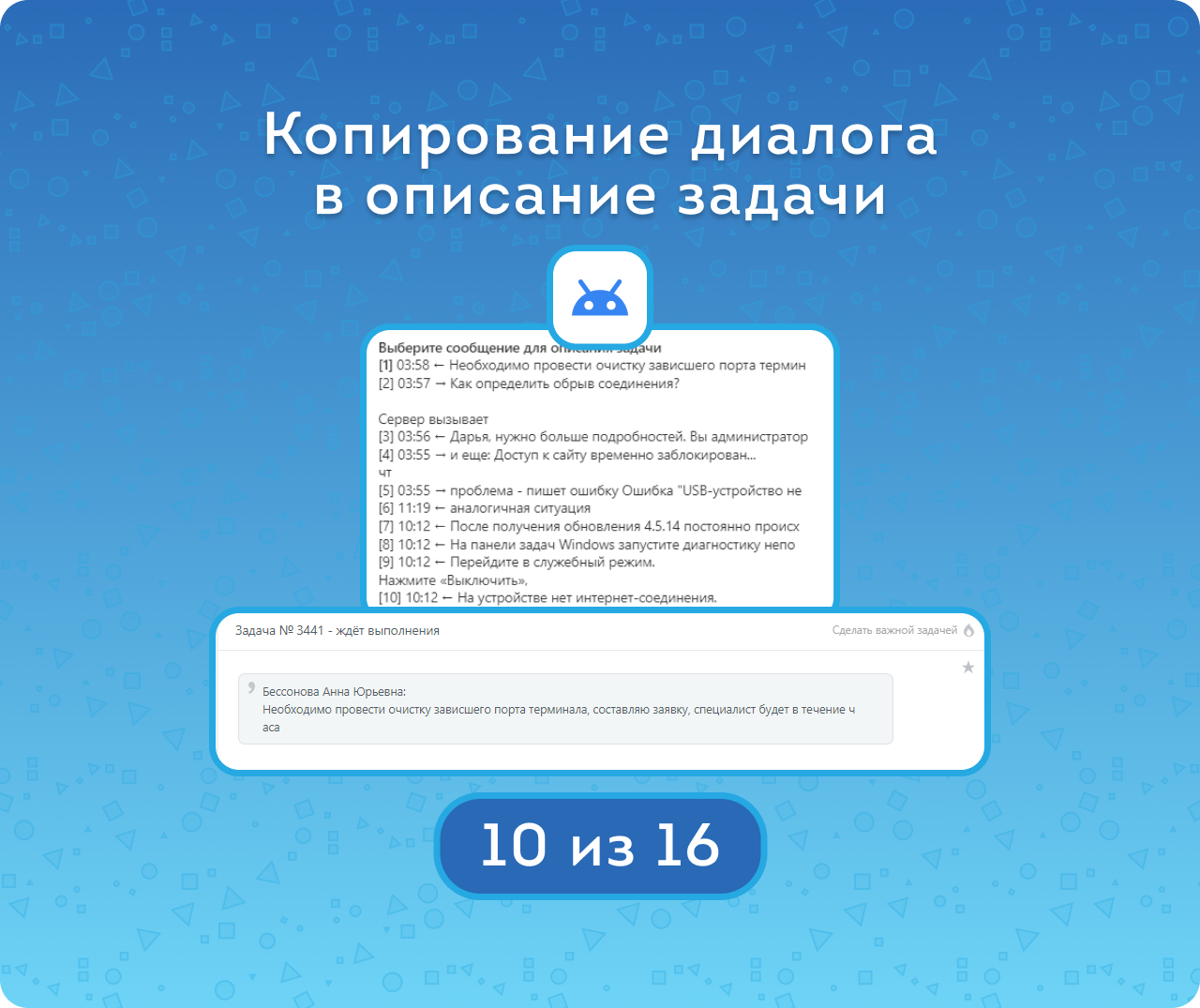 При создании задачи в чат-боте можно выбрать из 10 последних сообщений в чате.